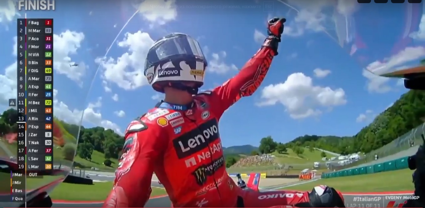В основной гонке из-за штрафа, Баньяйя стартовал со второй линии, но это не помешало ему во втором повороте выйти в лидеры! И лидерство он не отдал никому, победив в гонке. Но стоит отдать должное второму пилоту заводской Ducati, Энеа Бастианини. Сначала он долго шел на третьей позиции. Потом вернул свое место после обгона со стороны Марка Маркеса. И бросился буквально в погоню за шедшим вторым Хорхе Мартином. И на последнем круге обошел его! Дубль заводской команды в цветах Maglia Azzurra.