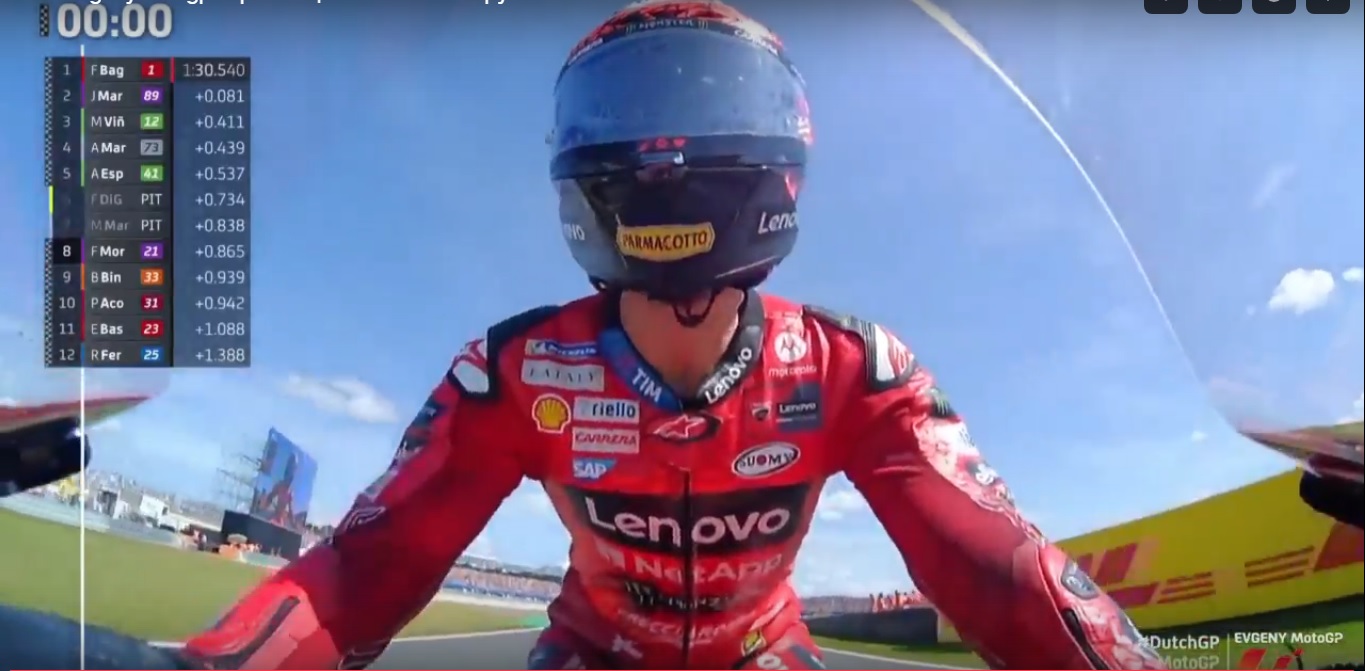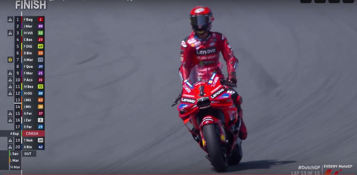 Он сразу вышел вперед и не позволил Хорхе Мартину даже приблизится на дистанцию атаки. Уверенная победа. Но также стоит отметить отличную гонку второго заводского пилота Ducati, Энеа Бастианини, который совершил прорыв с десятого места на третье.