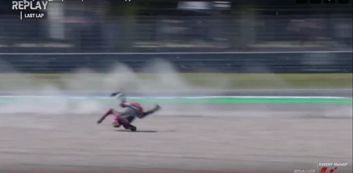 На последнем круге очень опасно падает Алейш Эспаргаро.