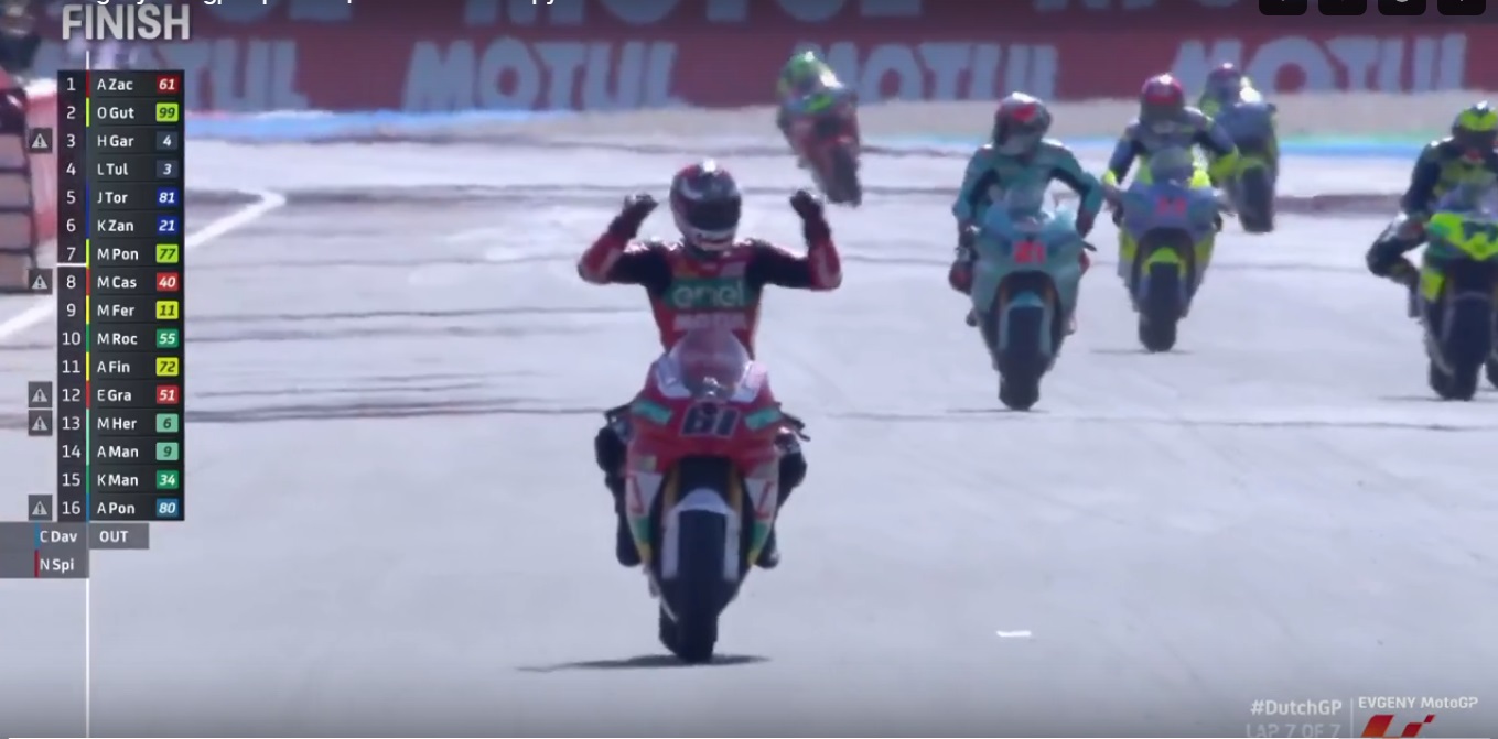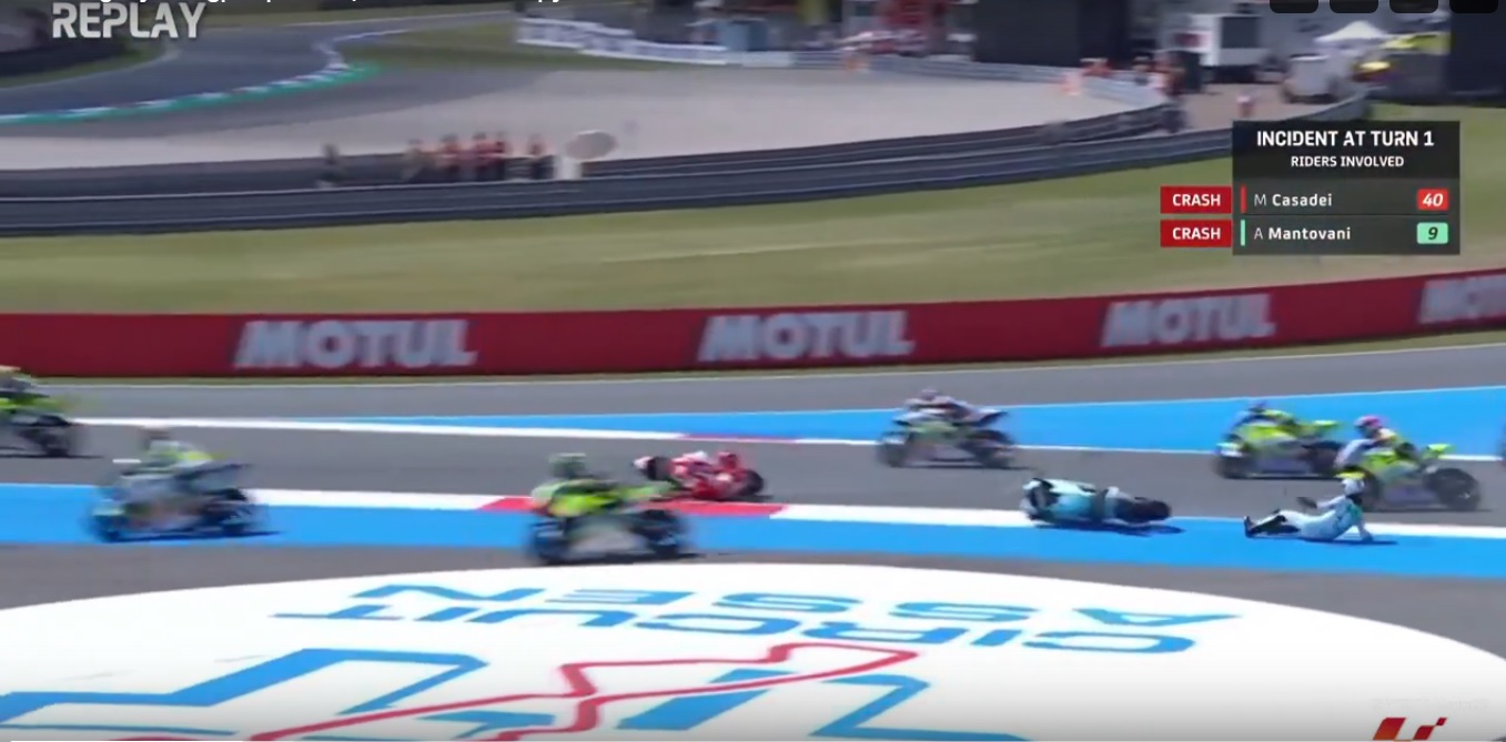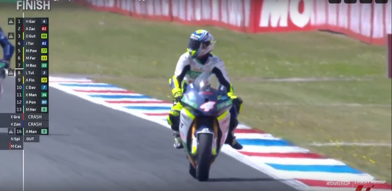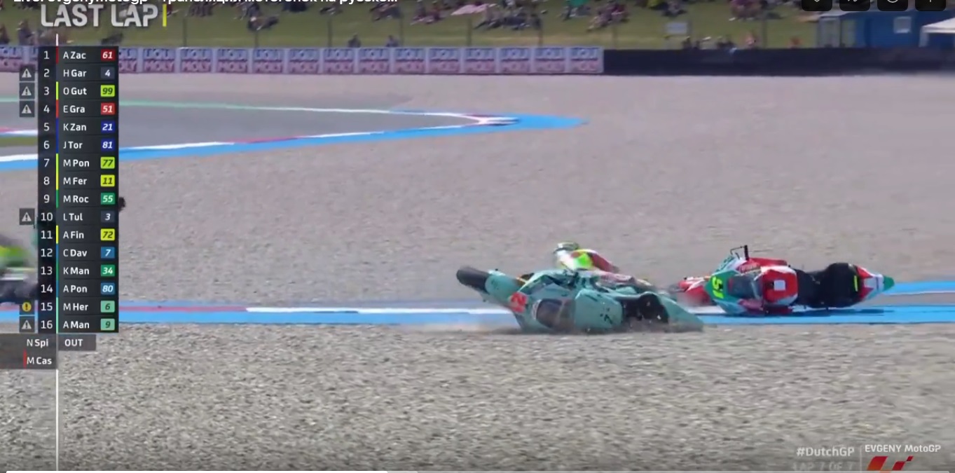 MotoE. Здесь же, в Ассене, прошел и очередной этап электрокласса. В первой гонке, буквально в первом повороте, выбывает из борьбы один из лидеров чемпионата (Казадеи).