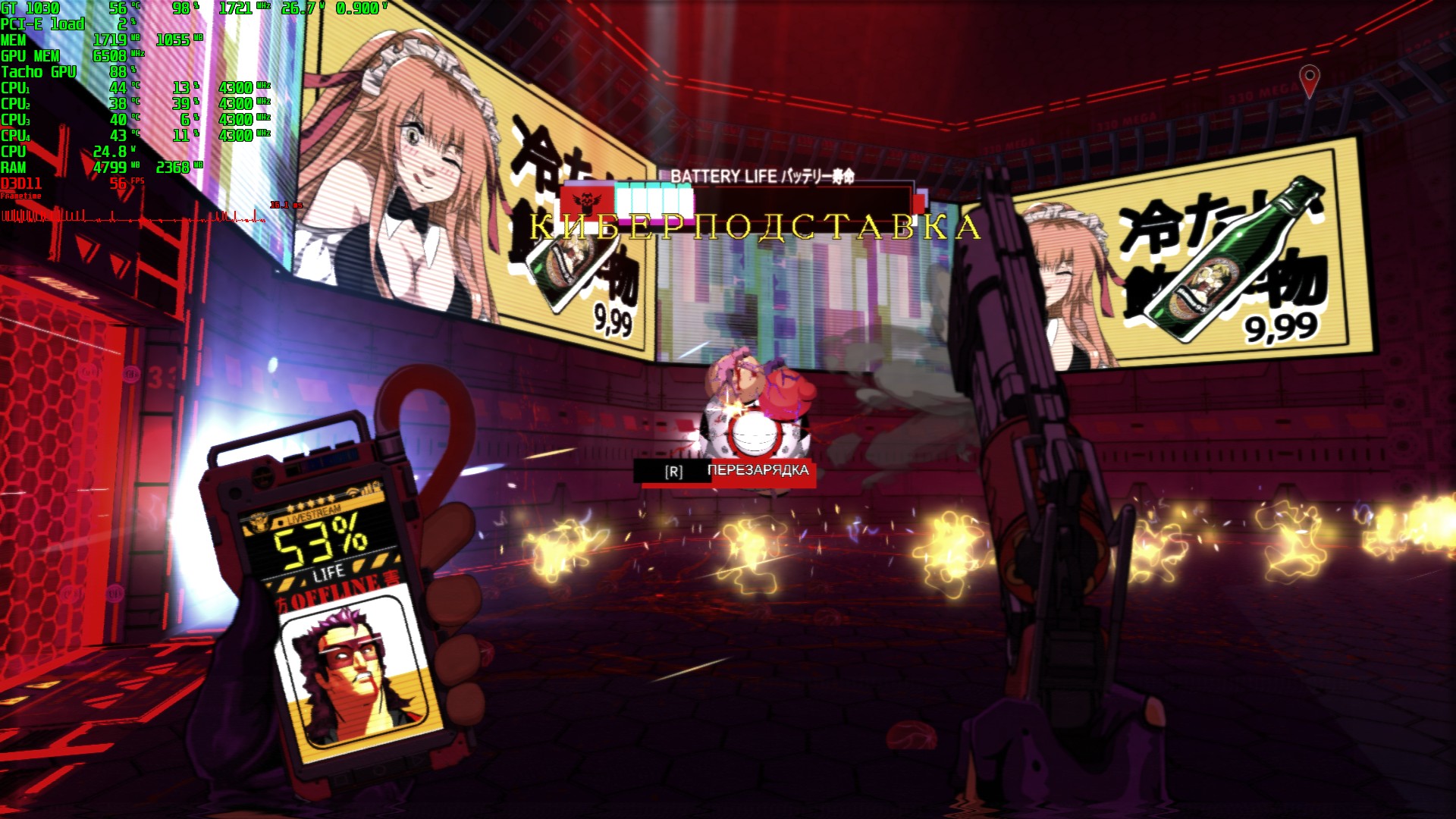 Итак, наш герой держит оружие (допустим, дробовик) в одной руке, а во второй - некий девайс, где отображается время, неумолимо сокращающейся жизни. За каждого убитого врага, дают несколько секунд. И наша цель успеть пройти уровень до окончания таймера. Собственно, в этом вся суть игры. Врагов обычно убиваешь с помощью оружия. Но можно использовать "предметы интерьера". Человекообразные роботы часто стоят напротив работающих вентиляторов, оголенных проводов и тому подобного. И можно просто отправить врага пинком в эту "ловушку смерти". Процесс несколько напоминает игру "Bulletstorm" в этом плане. Только счетчика очков за "красоту и извращение" нет. Также по пути встречаются автоматы с газированными напитками.