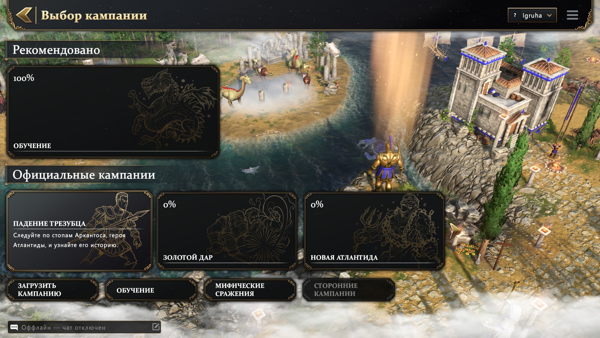 Как уже понятно из названия, игра посвящена мифам. Конкретнее, в самом начале, мифам Древней Греции. И эту тему я люблю, поэтому и стал игру рассматривать. В меню нас встречает три части основной кампании, которые можно проходить в любом порядке.