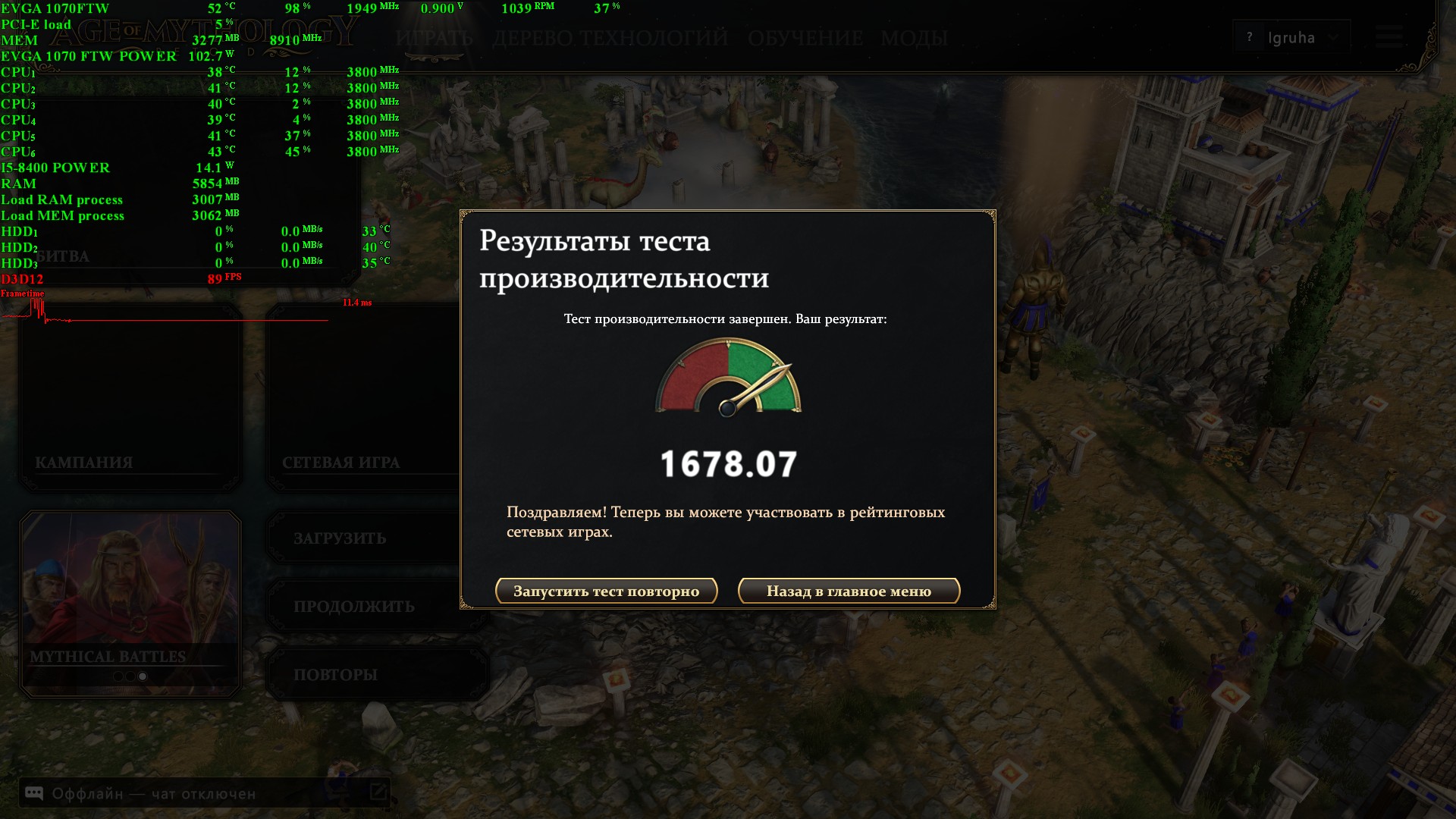Играть по сети можно. Но что показал сам мониторинг? 6 потоков процессора не всегда хватает, хотя загрузка по потокам никогда не достигает уровня 90-100%. Из-за этого видеокарта остается загруженной на 78-85%. Но, как только начинается "буйство спецэффектов", то уже видеокарта нагружается полностью, а средний фпс падает ниже 60. Но для стратегии это не важно.