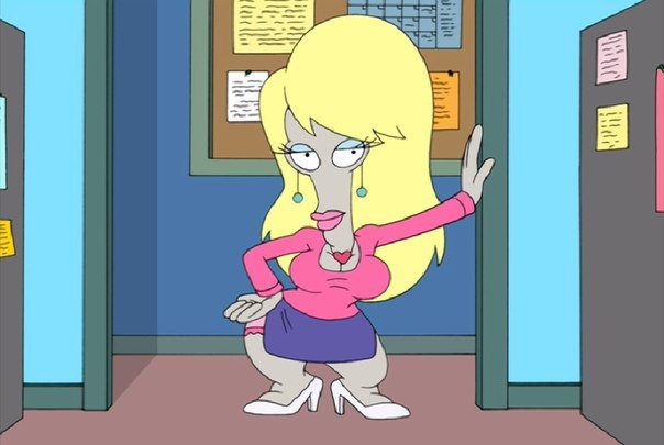 Начнем с того, что глава семейства, Стэн Смит, работает в ЦРУ. И это уже неожиданно. Он внешне полная противоположность и Симпсону, и Гриффину: здоровенная "волевая челюсть", широкие плечи. Это компенсируется очень скромным кругозором и просто неистовой приверженностью традиционным ценностям американцев. До смешного... Такой туповатый агент ЦРУ с любовью к демократам и ненавистью к республиканцам. Можно было бы сказать, что ярый трампист, но тогда еще Трамп президентом не был...