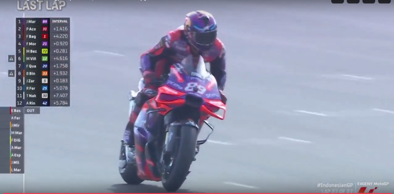 Педро Акоста ехал на второй позиции и к нему приближался Энеа Бастианини. Но он ошибается и падает. Франческо Баньяйя к концу конки смог прорваться на третье место, нивелировав свой проигрыш в очках.