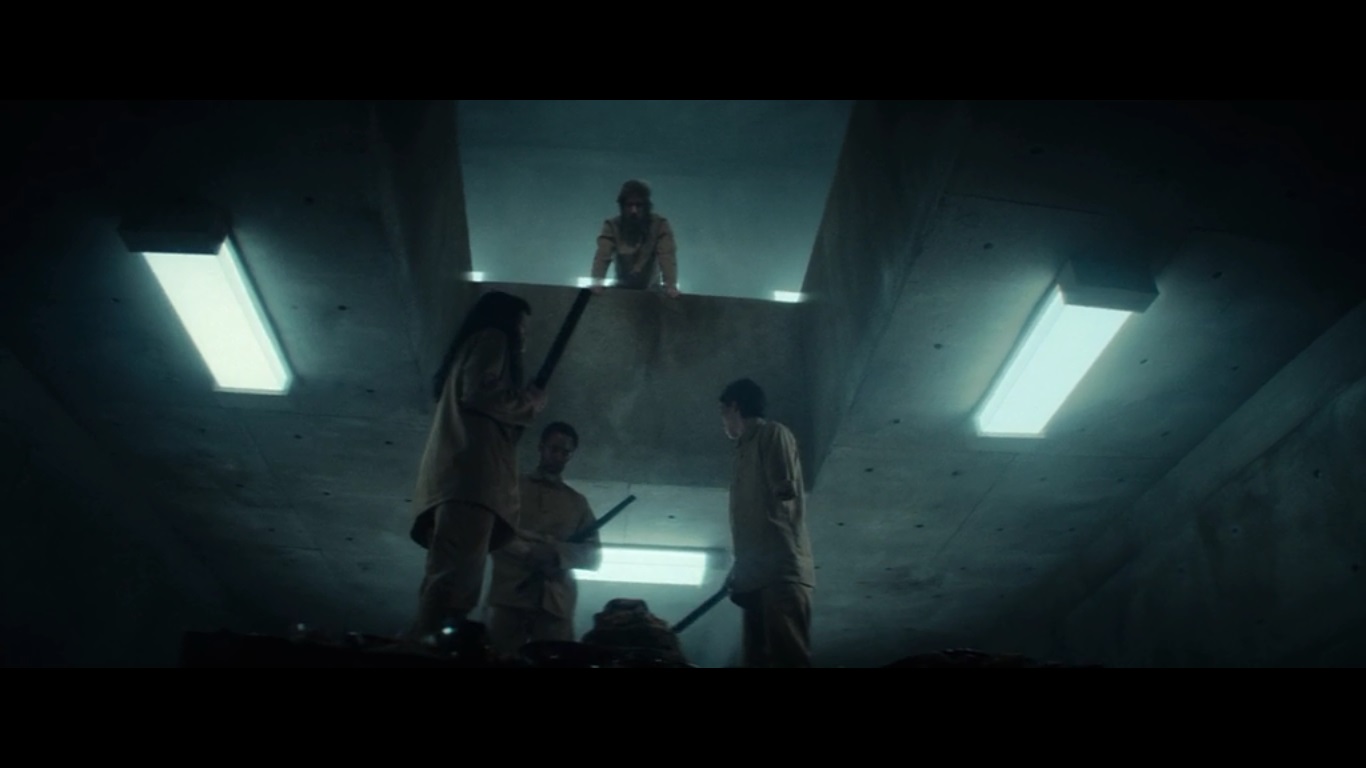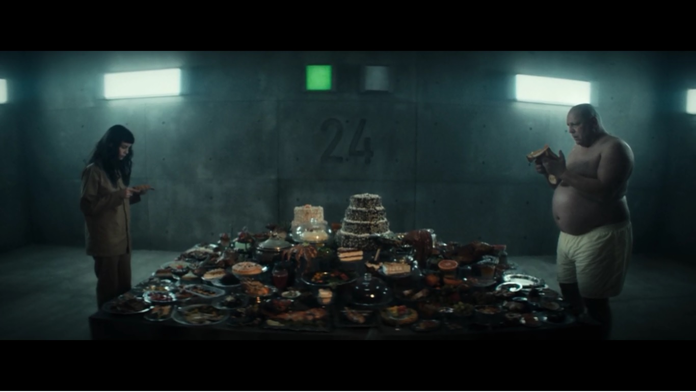 Сверху, раз в день опускают платформу с едой и ты можешь съесть только то, что твое. И по идее, всем должно хватать. Но те, кто выше, могут съедать и больше. Тогда нижним уровням достанутся жаренного свина ушки и обглоданный хребет палтуса... Что, собственно, мы и наблюдаем. Уже второй раз...
