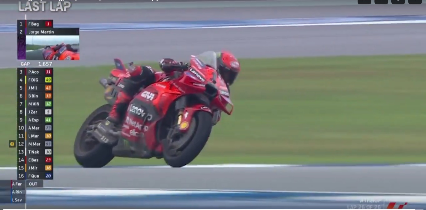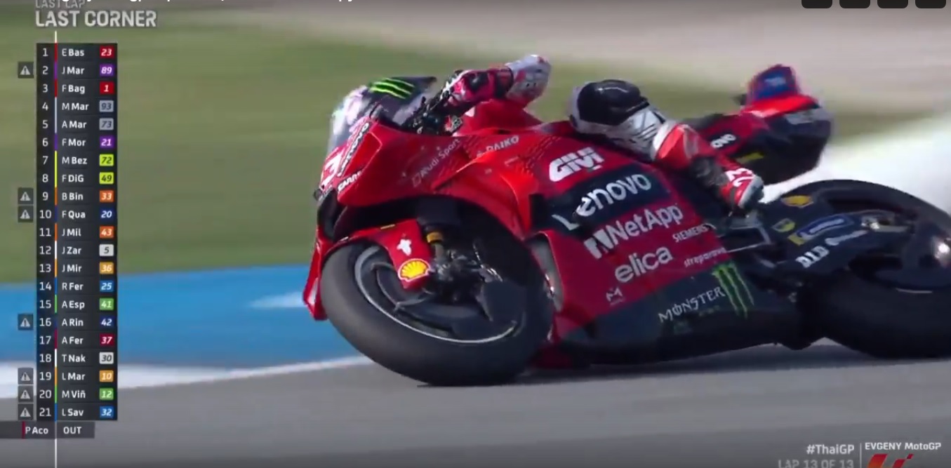 Сзади шла борьба по позициям. Провалил старт Мартин, но стал прорываться вперед. Сначала, он обгоняет Марка Маркеса, потом Баньяйю и выходит на второе место. Таким образом, разрыв между ним и заводским пилотом в чемпионате снова увеличился. Баньяйя, заняв третье место, максимально усложнил себе задачу: теперь для титула Хорхе Мартину достаточно всегда финишировать позади Баньяйи, чтобы стать чемпионом...
