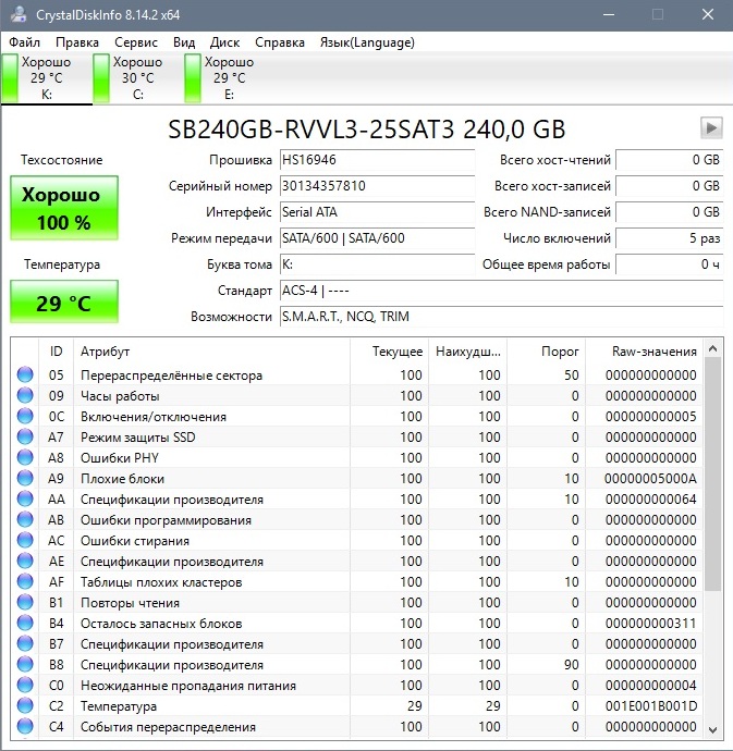 Утилита CrystalDiskInfo выдает по накопителю такую информацию: