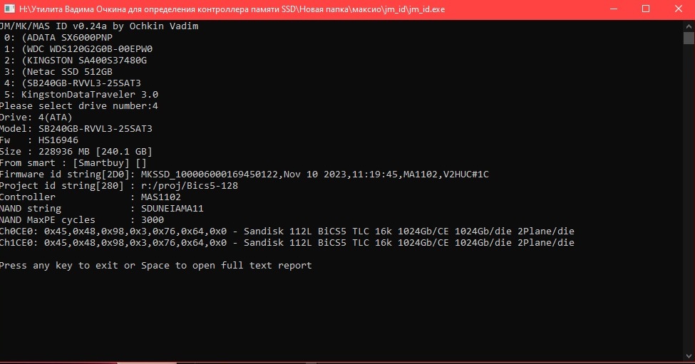 Программа считает, что там распаян заявленный Maxiotek MAS 1102 и память SDUNEIAMA 11 от Sandisk. Бюджетный контроллер, что и следовало ожидать...