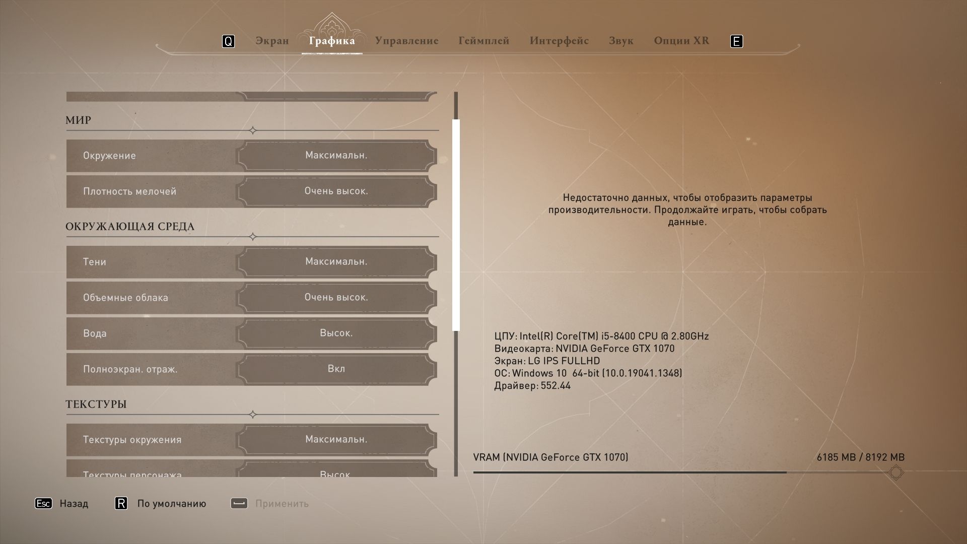 Но в игре всегда будет заметно хуже. Поэтому я для собственного тестирования выставил смешанные настройки: тени средние, также детализация окружения средняя. Облака выставил также в средний режим (помнится, в прошлой игре "Assassin’s Creed: Odyssey" они влияли на производительность). И отключил в последствие масштабирование. В таком режиме почти никогда нет просадок (на момент прохождения). Но вот при нескольких источниках света или возле текущей воды,