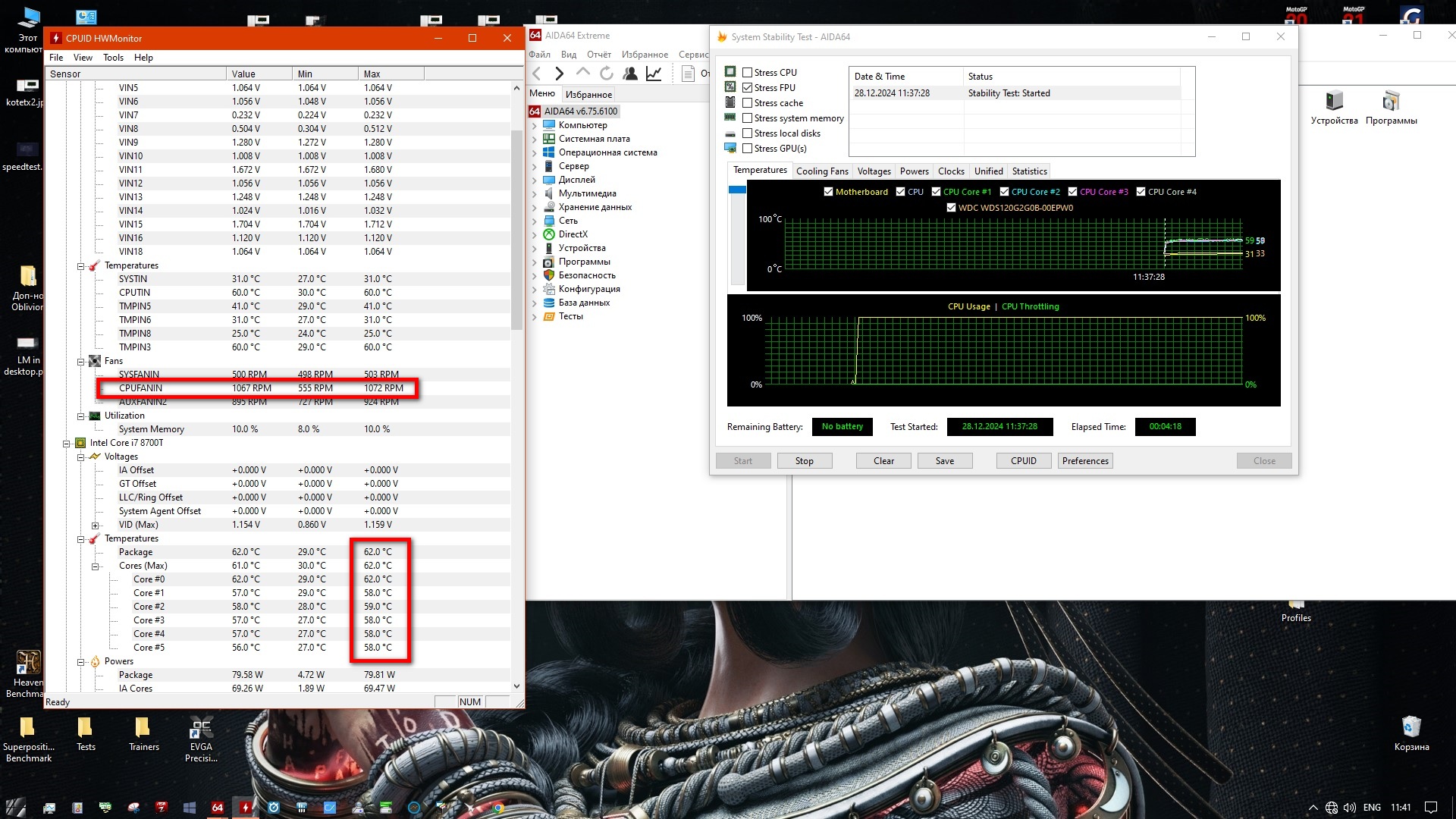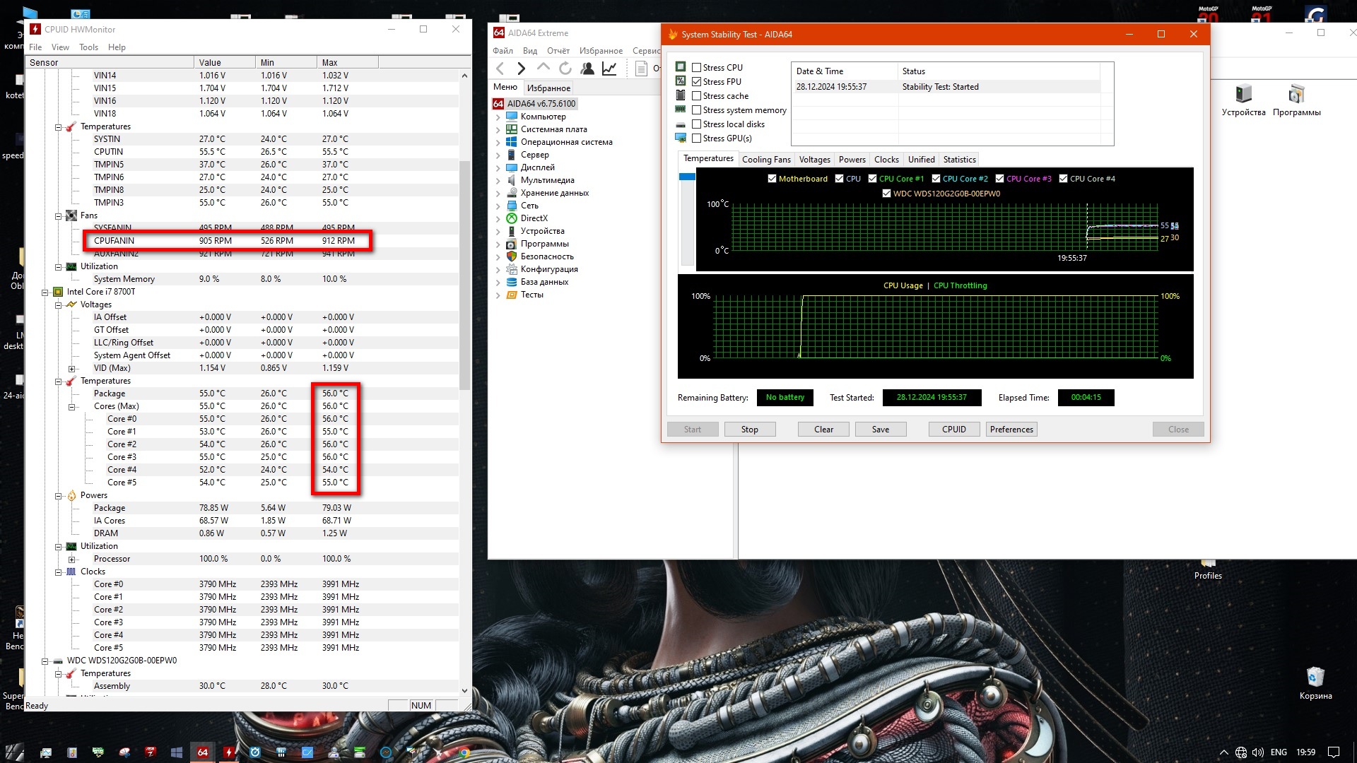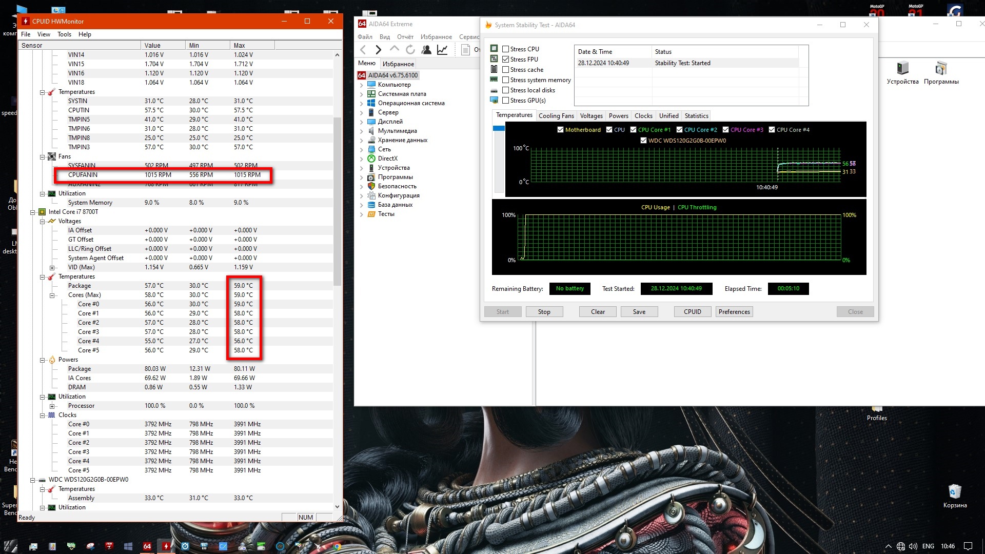 Тестирование пройдет с термопастой Coolmoon MT 8. Процессор i7-8700T (3800 МГц по всем ядрам), тестовая программа AIDA 64 (FPU only, в течение 5 минут), корпус NZXT Phantom 530 открыт. Температура в комнате 30 градусов...
