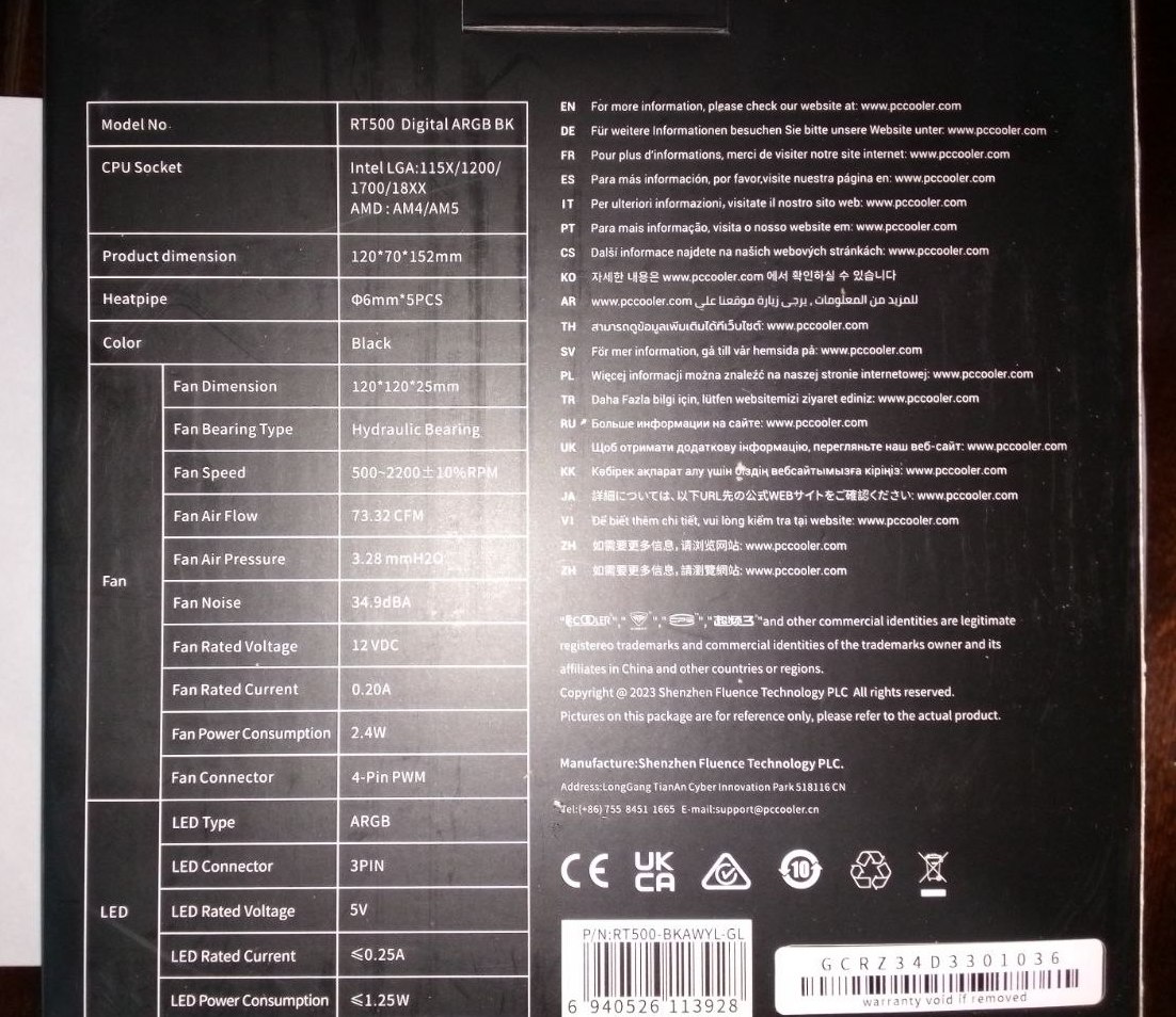 Но вернемся к "обозреваемому". RT500 - значит, радиатор имеет 5 теплотрубок (есть еще версия RT 400). ARGB - вентилятор с адресной подсветкой. Ну, а Digital - наличие небольшого экранчика, на котором отображается температура процессора.