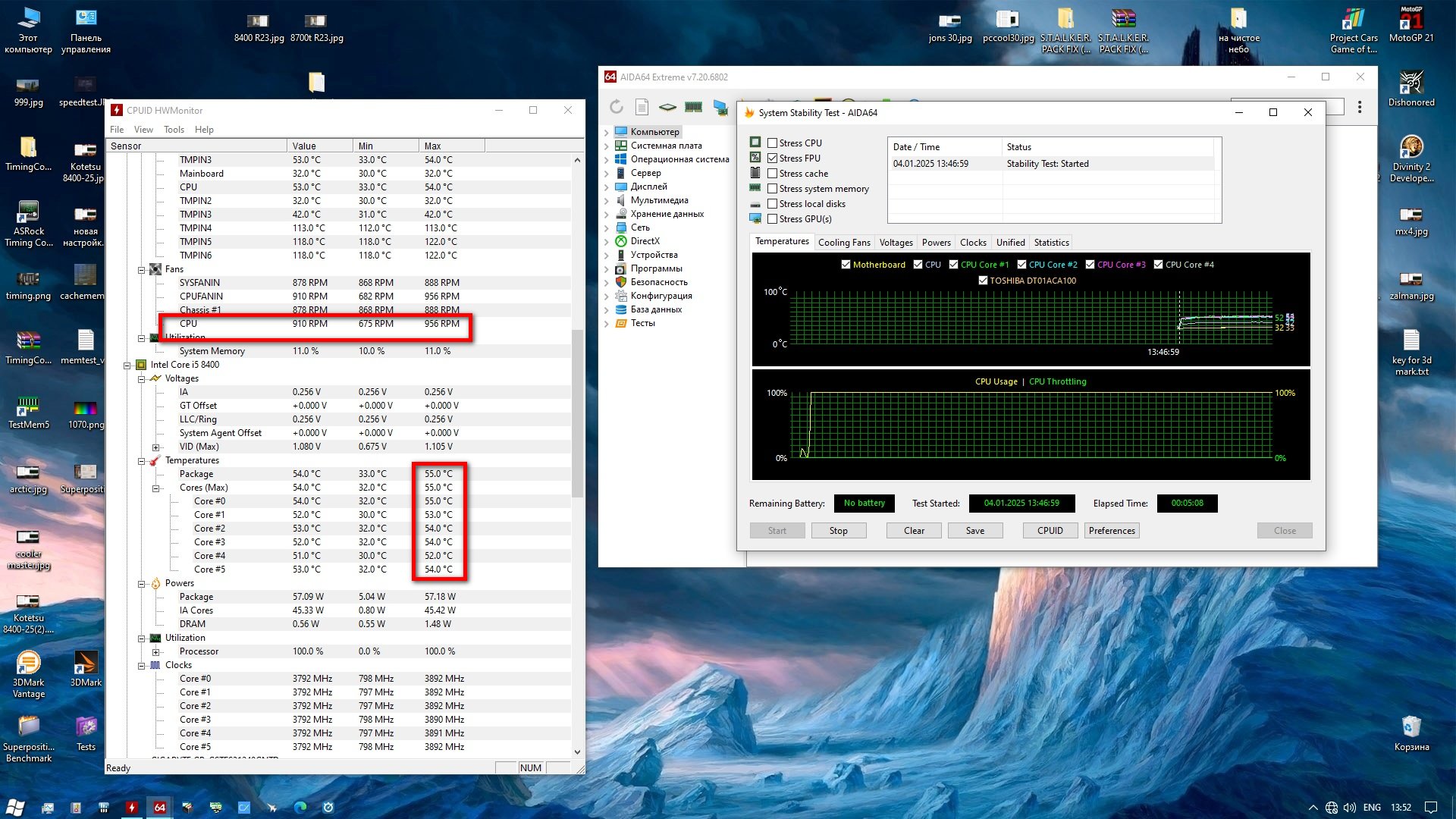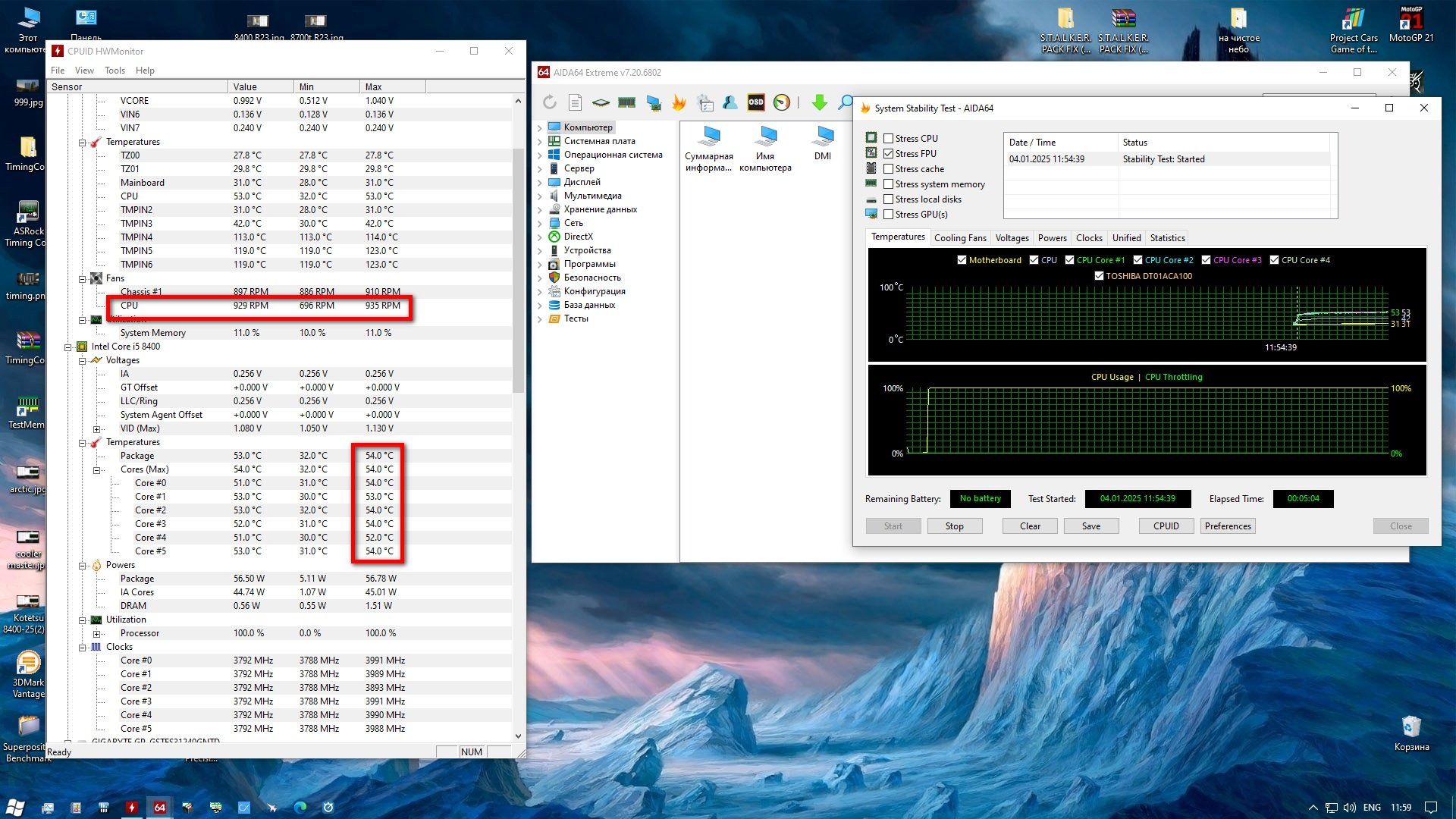 54 градуса.Пока я перебирал ПК, в комнате немного выросла температура (примерно 30,5 градусов).