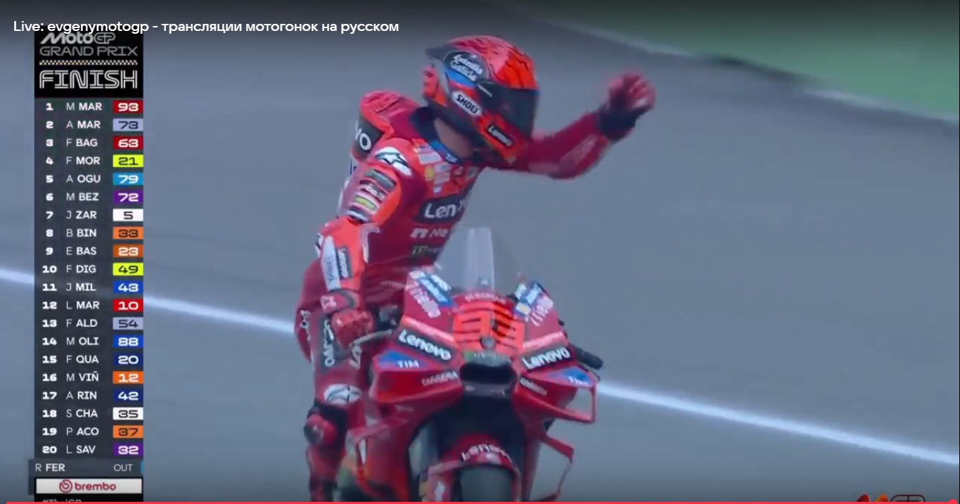 В итоге, весь подиум за Ducati. Очень хорошо выступил новичок MotoGP, Аи Огура на Aprilia. Он финишировал на четвертом месте, что для команды Trackhouse Racing очень хороший результат. Кстати, в этой гонке, у команды новая ливрея в честь спонсора Gulf.