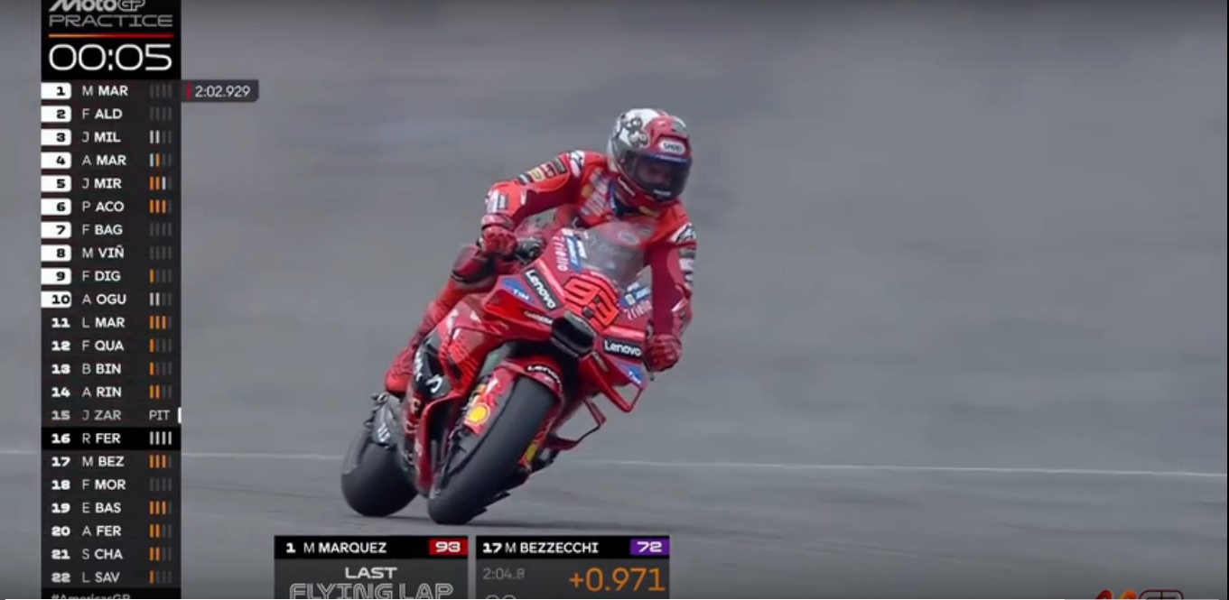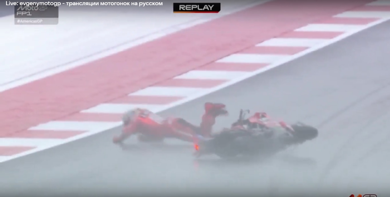 MotoGP. Гран-При Америк, COTA. Первая свободная практика выдалась очень неудачной в плане погодных условий: трасса была мокрой от дождя. Это очень сильно "перетряхивало" позиционирование пилотов. Конечно, были и падения. Первым упал Марк Маркес, благо сам не пострадал.