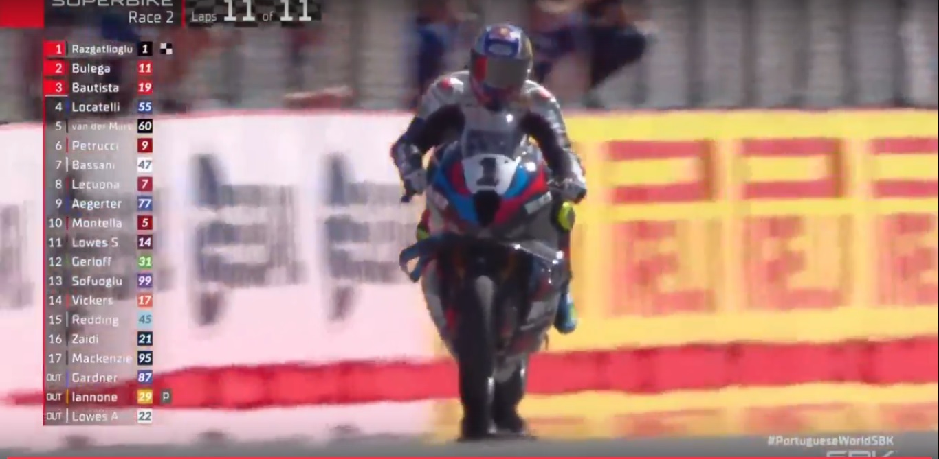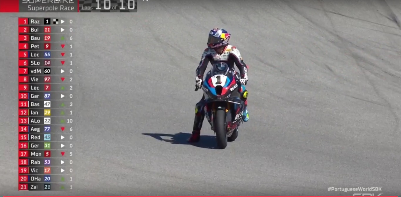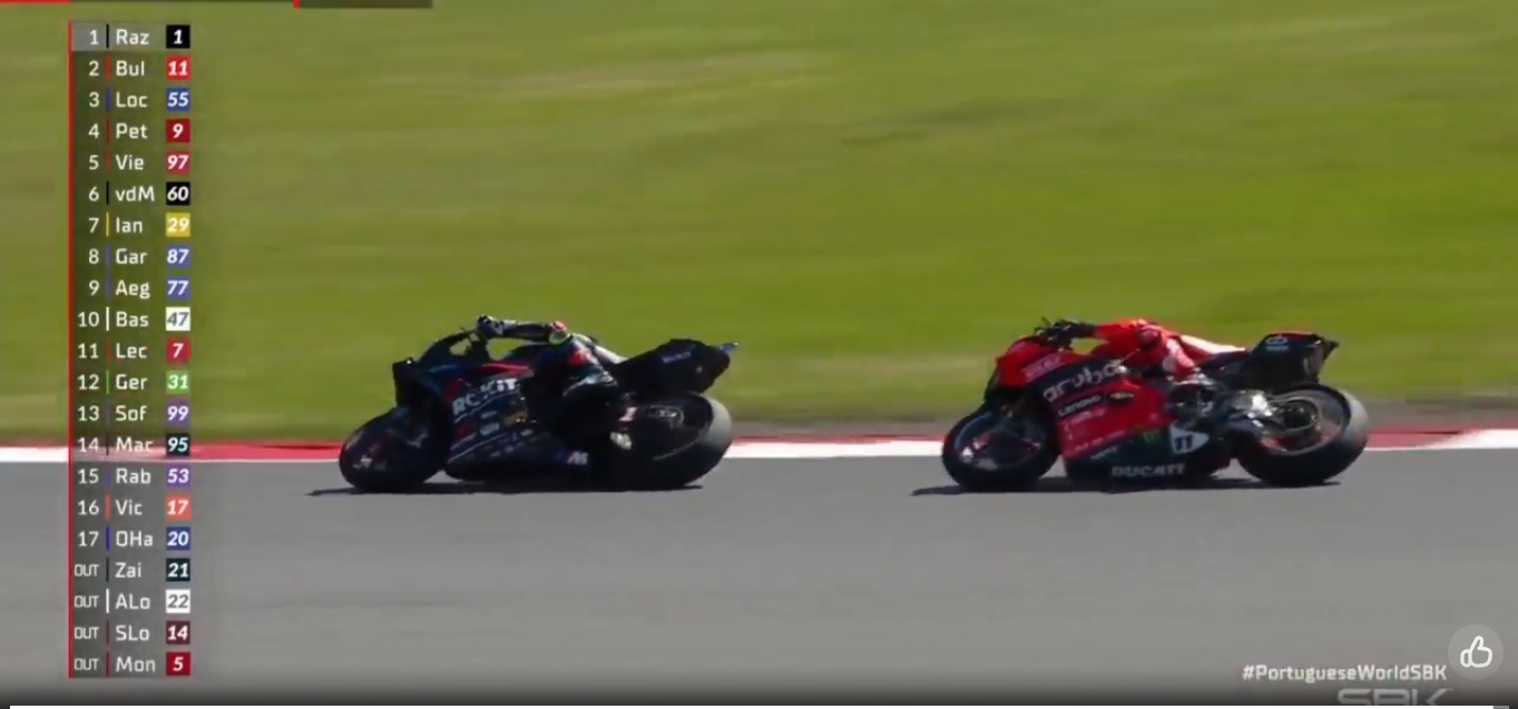 WSBK. Португалия, Альгарве. Гоночную сессию начал с лидирования уже в практике Топрак Разгатлиоглу (BMW). И чего-то не было от него слышно "причитаний" о "тотальном доминировании" гонщиков на Ducati...