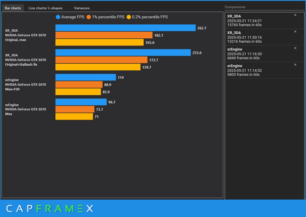 Оригинальная игра.Проверим производительность в оригинальной игре и ремастере. Настройки во всех случаях будут максимальными. Сначала проверим ремастер в двух ипостасях: на максимальных настройках графики и с включенным FSR (качество). А затем проверю в оригинальной игре. Но еще я проверю игру с фиксами от самого Сталкаша (ссылки на скачивание он дал во время стрима). Все их ставить не буду: лишь сами фиксы, без модов.