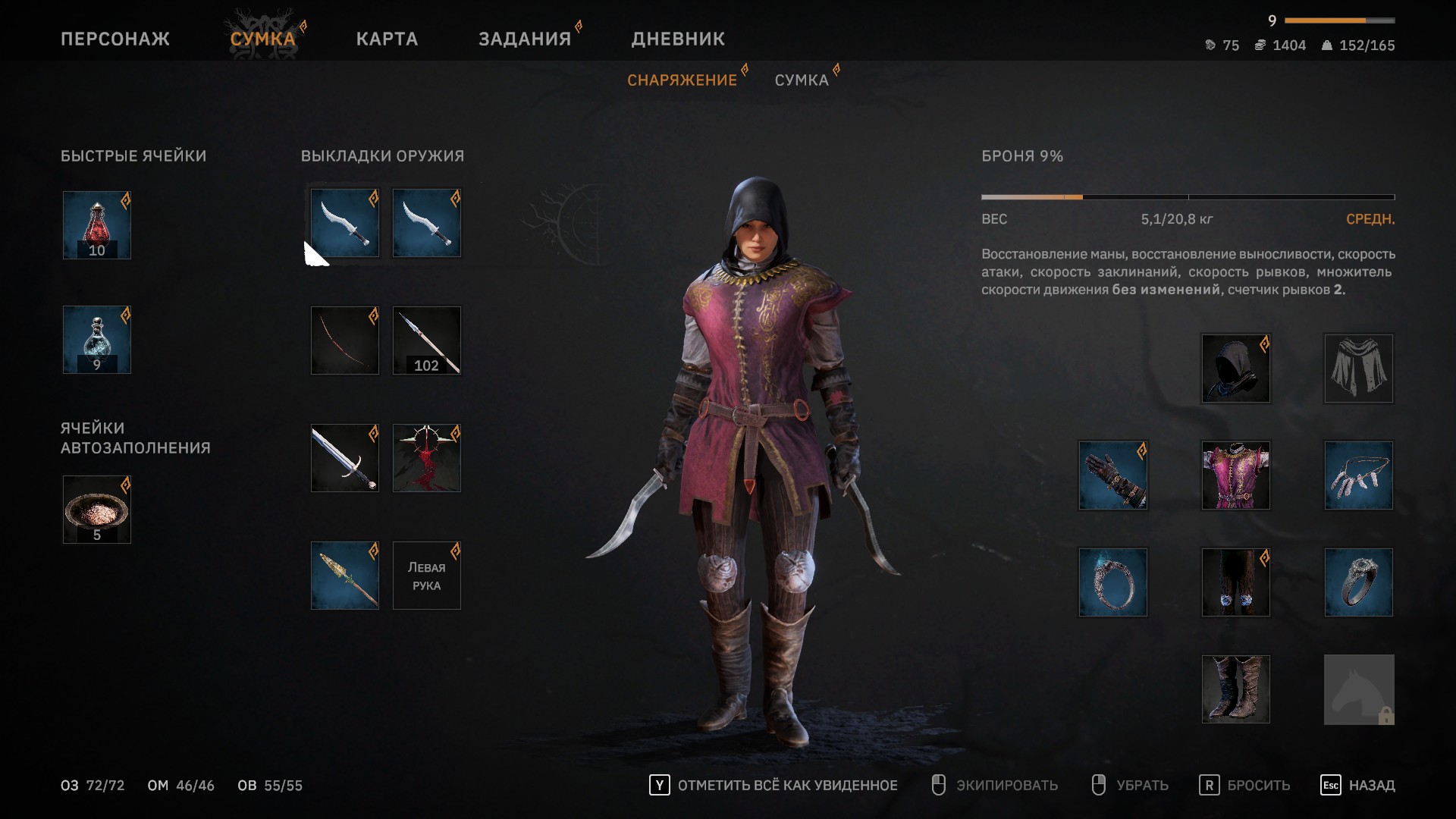 Меню персонажа.Еще одна странность – настройка переносимого веса персонажем. Тут, как в типичных "Свитках", есть общий вес, при превышении которого уже не побегаешь. Но, есть и настройка веса одетого снаряжения! Все, как в "Dark Souls". То есть, у вас может быть перевес не по общему "шмутью", а по надетому на вас! Зачем такие "навороты"? Интереснее играть? Нет.
