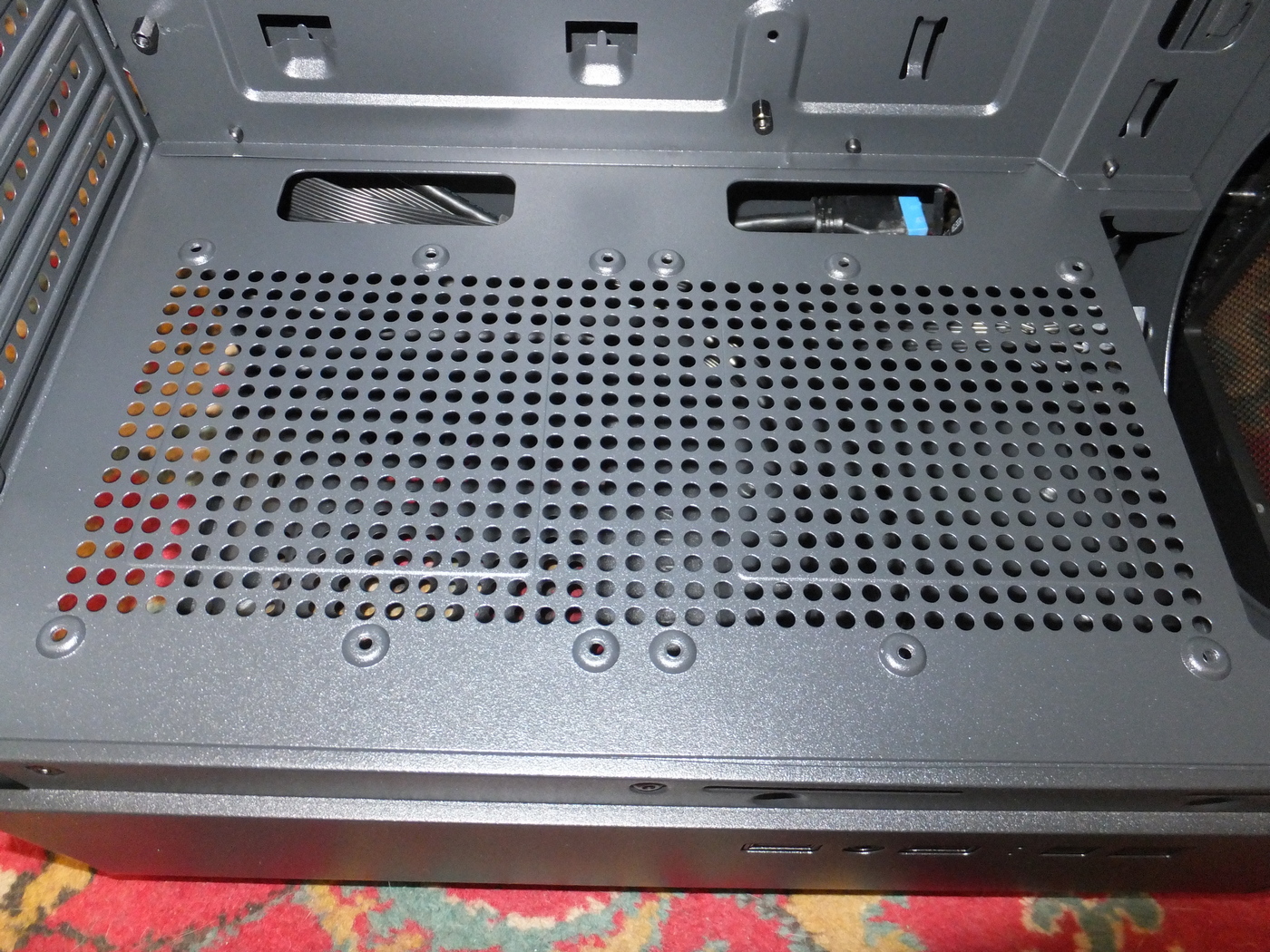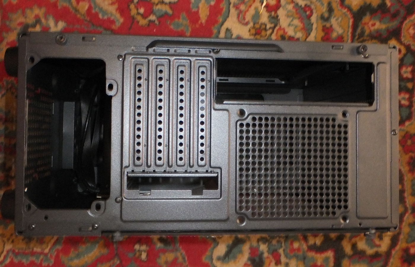 Снизу все печально: вообще нет фильтра для блока питания, а ножки корпуса не имеют резиновых вставок.