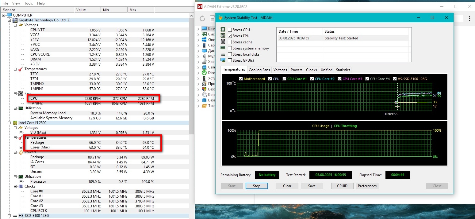 Изначально я планировал сделать два теста: в программе AIDA 64 и в Linx. Но, измерив температуру подсистемы питания пирометром, от использования Linx решил отказаться. Дело в том, что при пятиминутном стресс-тесте AIDA 64 (FPU only) она уже достигла 97(!) градусов. И это очень много для стокового процессора. Причина не только в слабой подсистеме питания без радиаторов. Тут еще влияет и тот фактор, что на процессор подается уж слишком высокое напряжение Vcore. И оно, как я писал выше, не регулируется. Также стоит сказать, что такая же ультрабюджетная материнская плата от Gigabyte, но на чипсете Н61, грелась заметно меньше. И там не было такого высокого вольтажа на этом же процессоре…