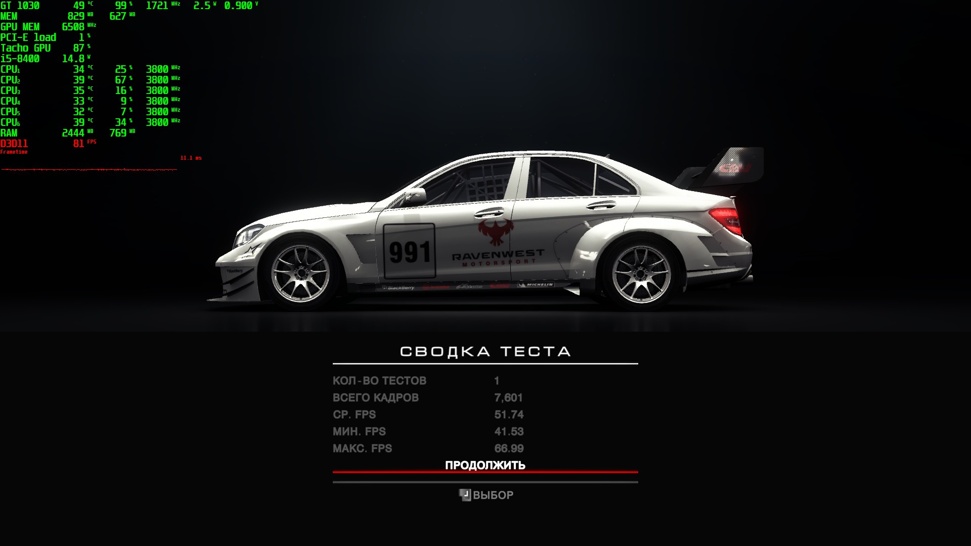 «Grid Autosport» тяжеловат для GT 1030, но разницы практически нет – в обоих случаях средний фпс держится на уровне почти 52 кадров.