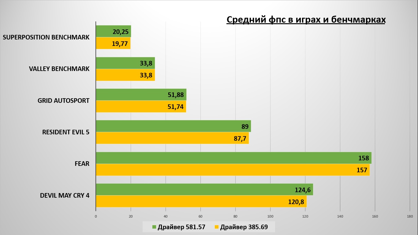 Тестирование производительности видеокарты GT 1030 на драйверах версий 581.57 и 385.69