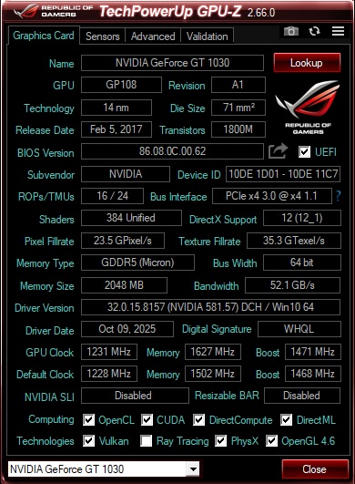 Итак, буду проверять производительность видеокарты GT 1030 на разных версиях драйверов. В качестве нового выступит драйвер версии 581.57 – WHQL, который вышел в релиз 14 октября 2025 года (последний на момент написания статьи).
