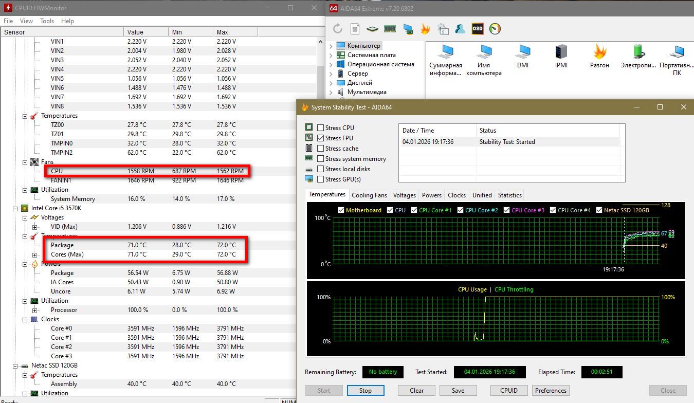 С вентилятором Arctic P12 ARGB температура составила 72 градуса при 1562 оборотах: