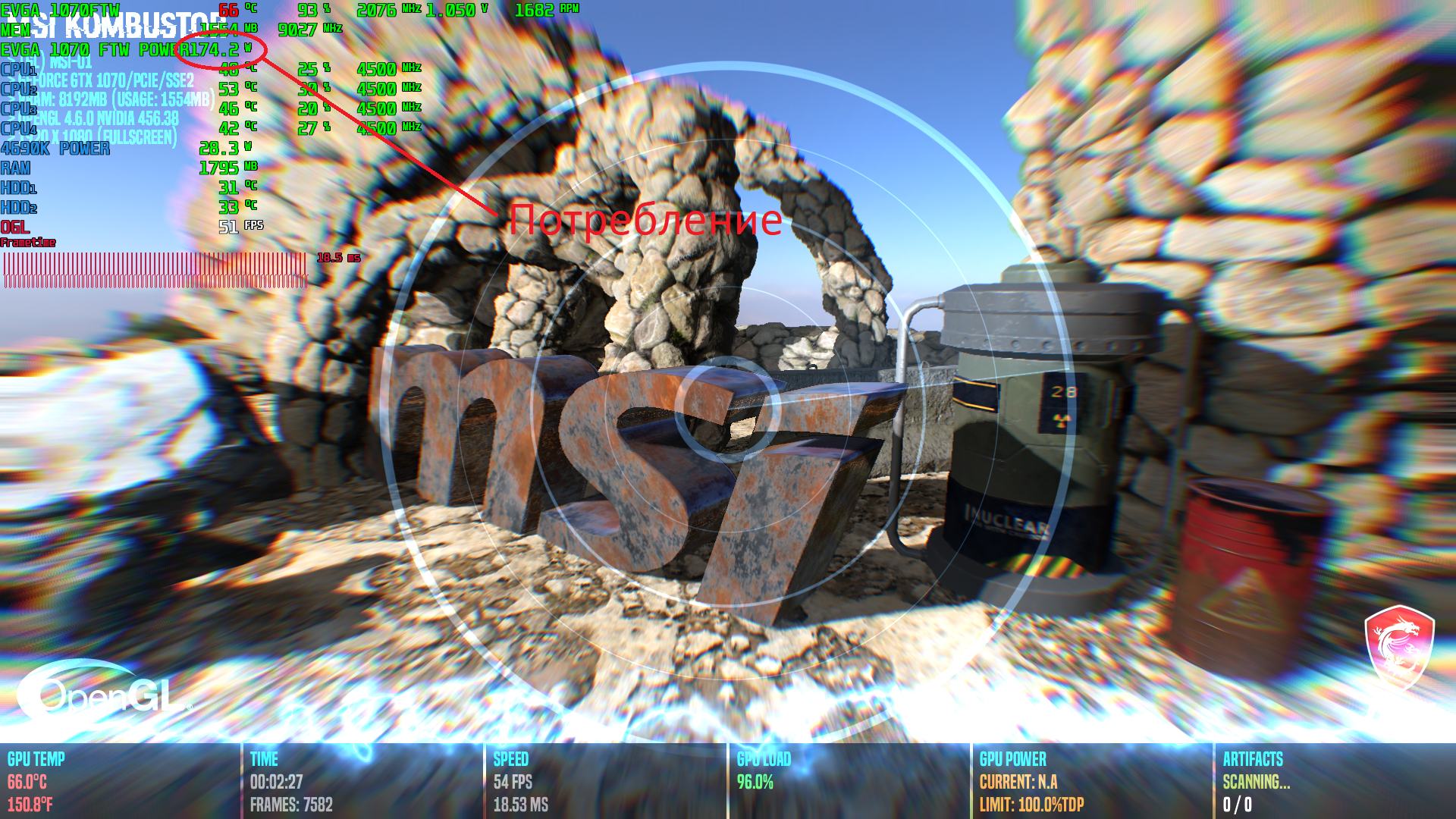 Потребление проверю в MSI Kombustor с включенным сканером артефактов.