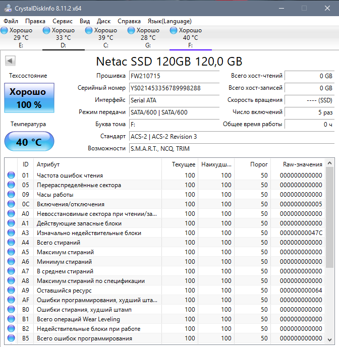Реальный объем составляет 112 Гб и датчик температуры залочен на 40 градусах (в течение тестов его показания не менялись).