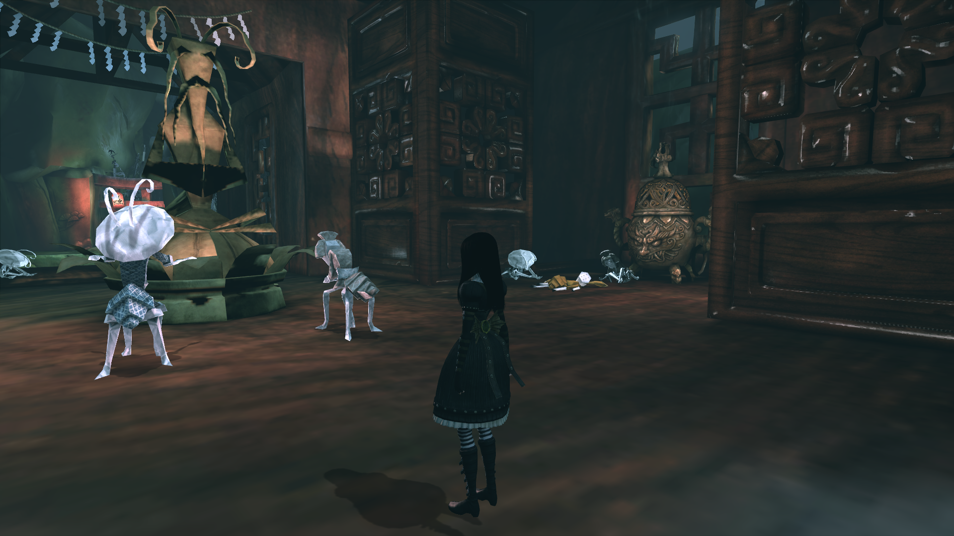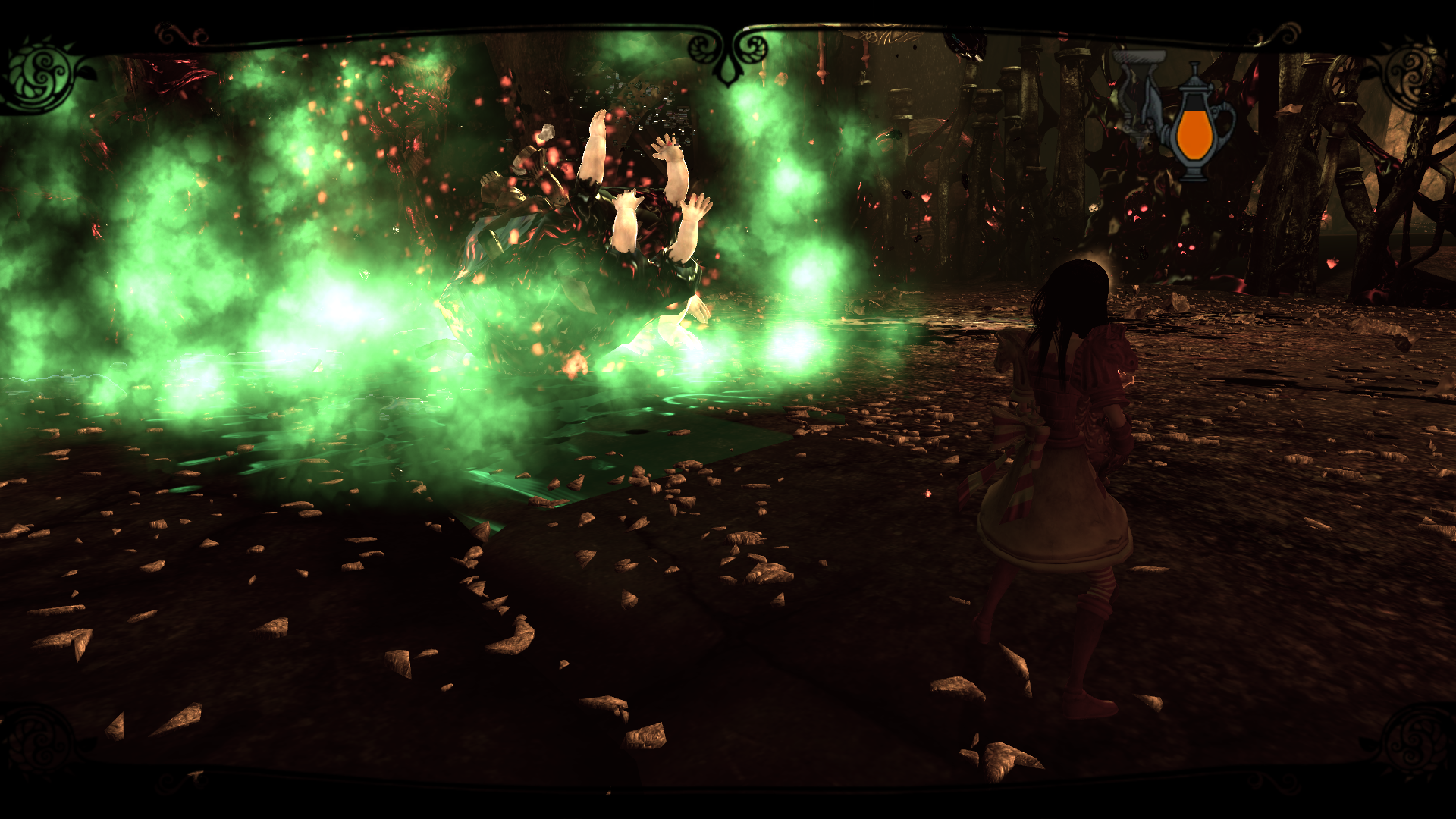 Следующий неприятный момент - само управление. Частично "ватность" можно победить. Но не до конца. Раскладка клавиатуры неудобная. Отдельно можно выбирать стрелковое оружие и отдельно - оружие ближнего боя. Это вносит путаницу. Можно было все сделать на колесо прокрутки мыши. Но нет, надо поизвращаться! Левая кнопка мыши отвечает за ближний бой, а правая - за дальний. После обычных шутеров привыкнуть к такому непросто. Реализация боев также хромает. Некоторых противников можно убить только в режиме "фиксации цели". Наподобие таковой в Дарк Соулс. Но вот сама реализация... Камера не остается всегда за спиной Алисы и возможна такая ситуация, когда враг оказывается между Алисой и монитором. И вы ни черта не понимаете, что там происходит! И это опять "проклятие консольных генов".