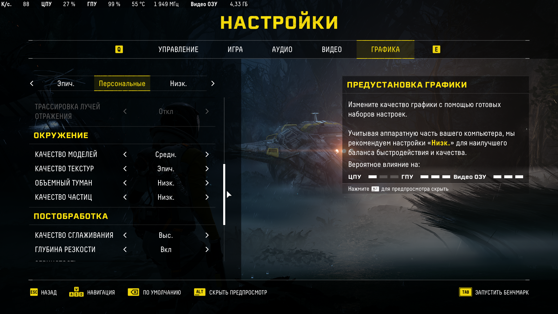 Пораскинув мозгами, выставил свои настройки, взяв за основу минимальные, но сделав среднее качество моделей и ЭПИЧНЫЕ текстуры: