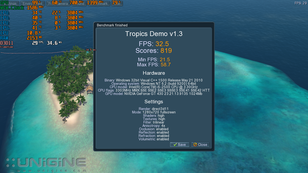 Вот так прогрелась видеокарта в разгоне в бенчмарке Tropics Demo: