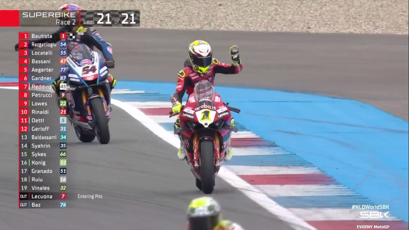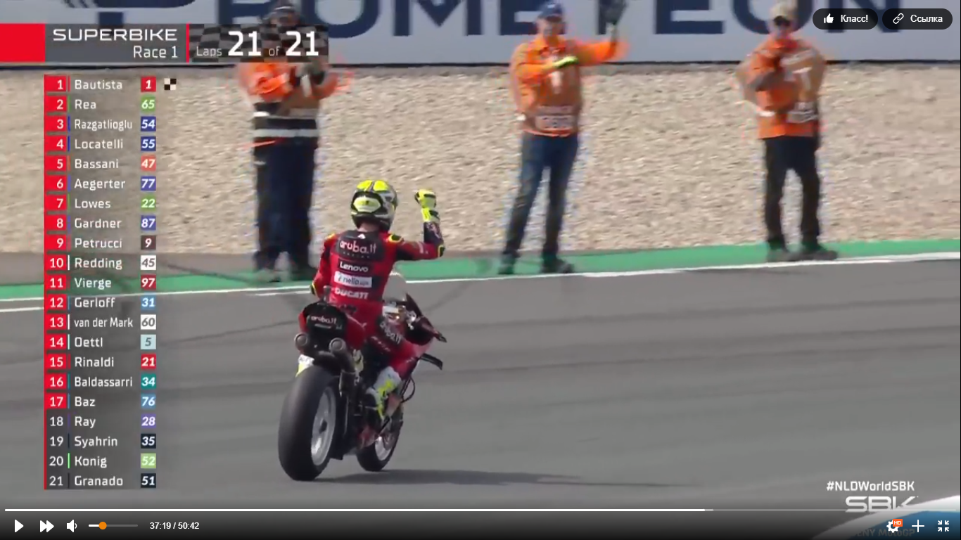 В Ассене (Нидерланды) прошел этап мотогонок WSBK. Лидером в субботней гонке на старт уходил Джонатан Рей на Kawasaki. Но уже к середине дистанции на дистанцию атаки к нему прорвался с четвертого места, Альваро Баутиса на Ducati. Через несколько кругов прессинга, он выходит в лидеры гонки и наращивает отрыв от преследователей.