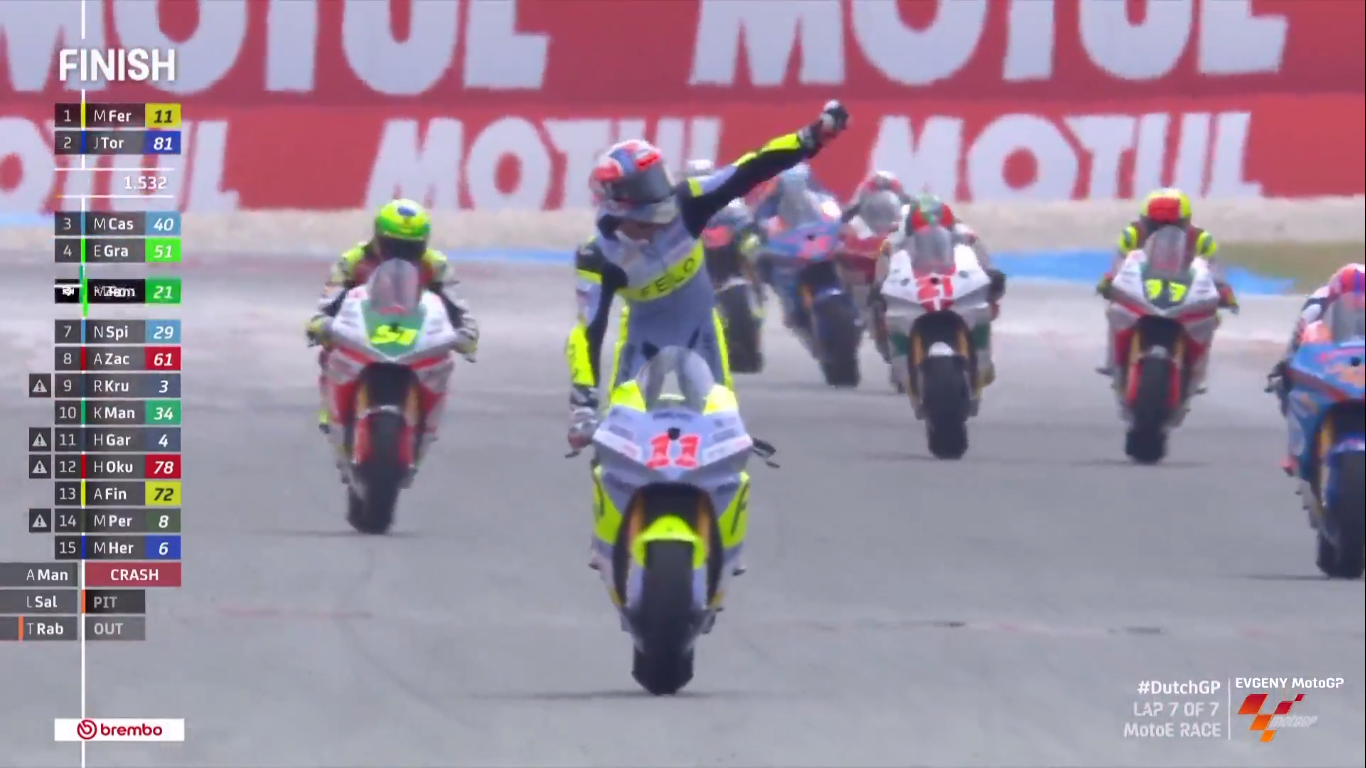 Во второй гонке победу снова одерживает Маттео Феррари (Felo Gresini MotoE), который навязал борьбу лидирующему первую часть гонки, Жорди Торресу (Openbank Aspar Team).