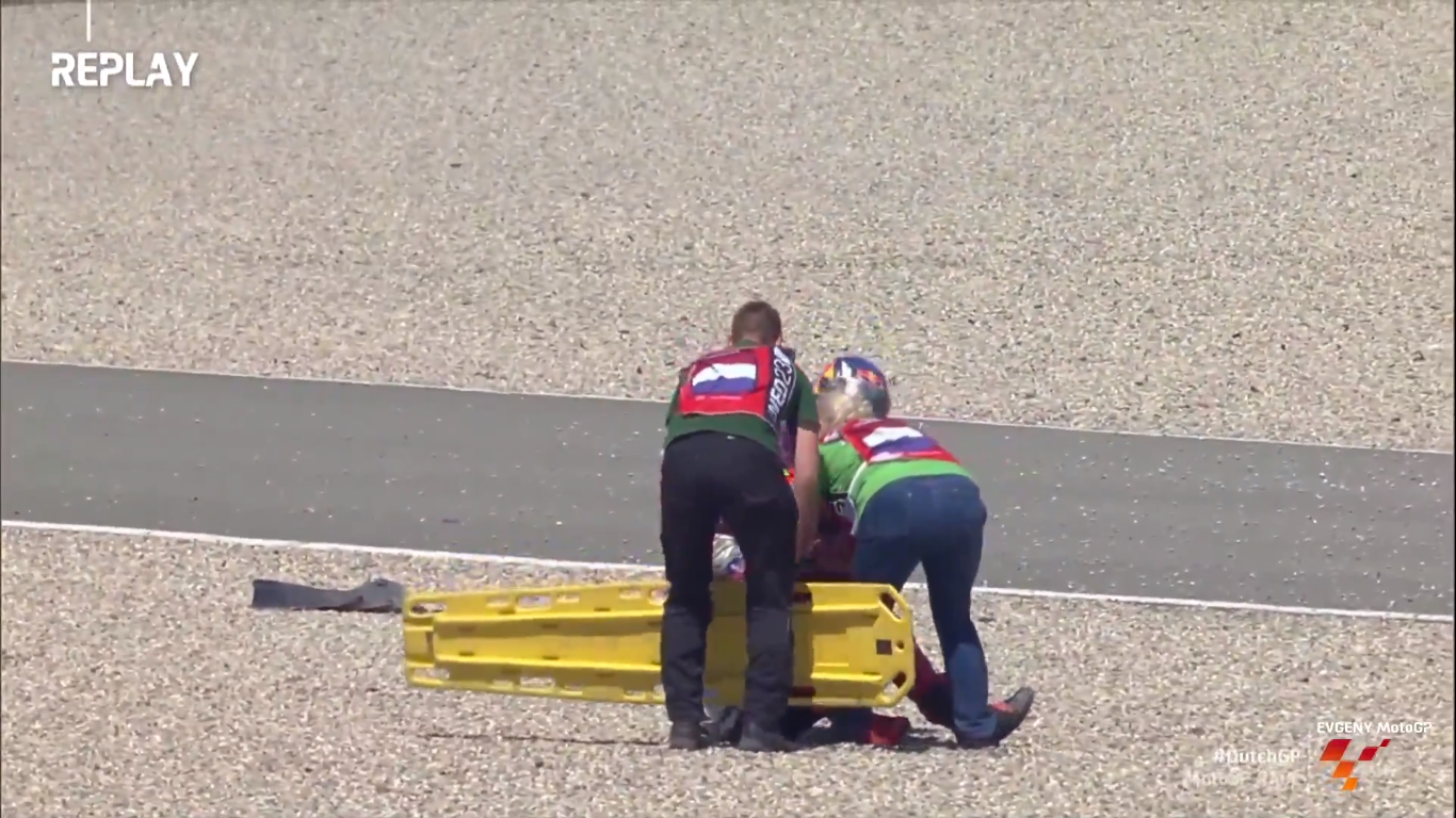 В основной гонке, которая проходила в воскресенье было очень жарко. И на трассе, и в воздухе. Марк Маркес отказывается от выступления, мотивируя это травмами. Жара привела к массовым падениям пилотов.