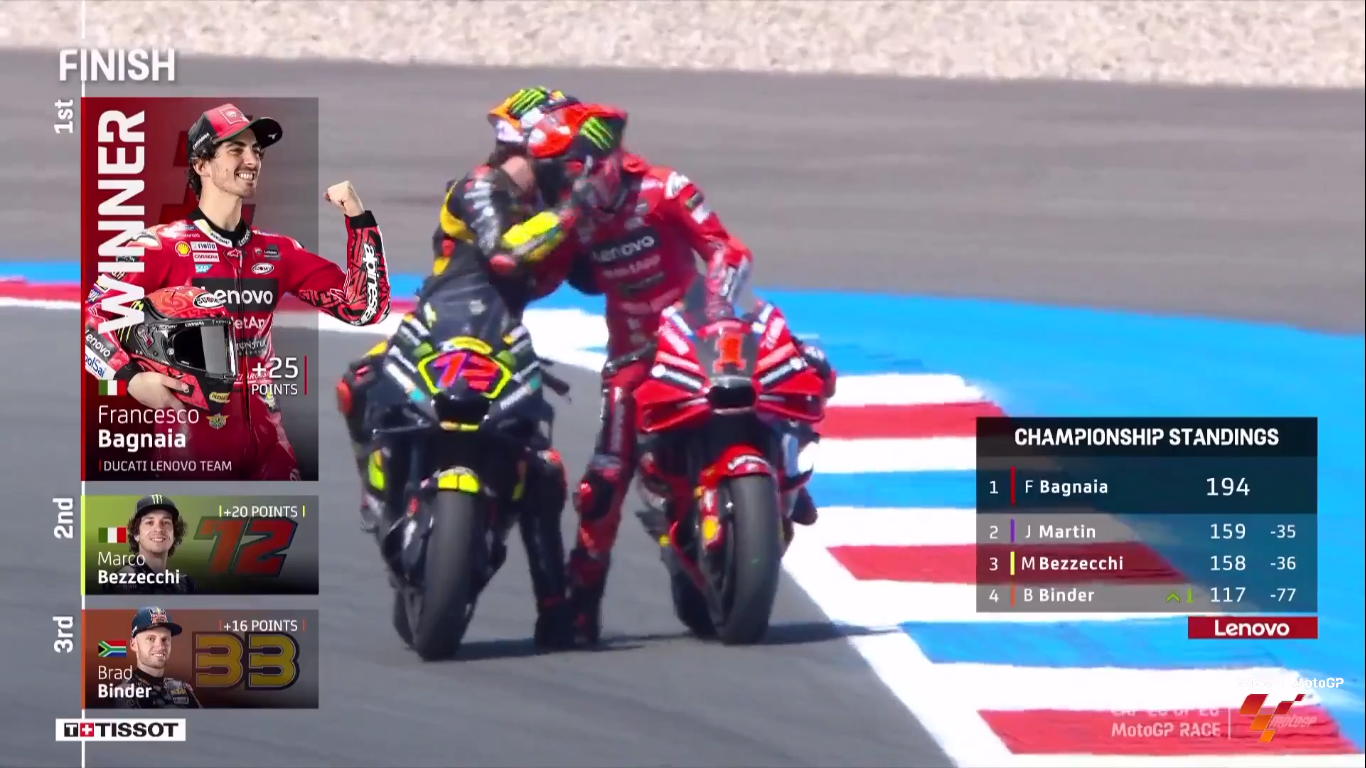 Формально, третьим приехал Биндер, но он на последнем круге получил штраф длинного круга (что вылилось в несколько секунд штрафа). И таким образом, третьим становится Квартараро (Monster Energy Yamaha MotoGP), чему он был несказанно рад. Ведь это только второй его подиум в этом сезоне...