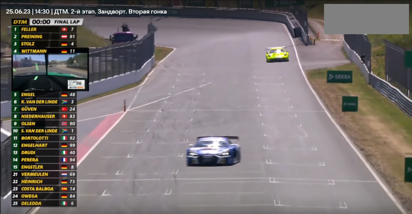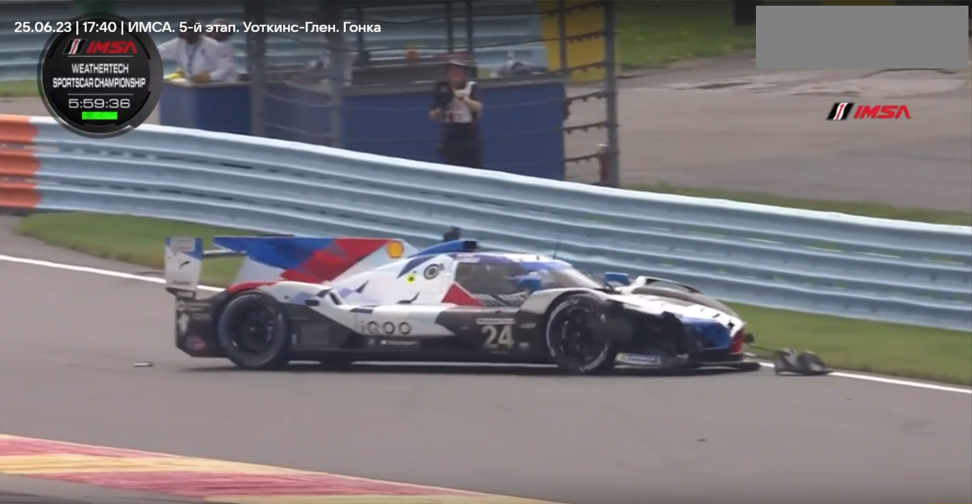 Примерно за пять минут до конца гонки, лидирующую позицию теряет BMW класса GTP. А за две с половиной минуты до окончания, из-за аварии BMW,