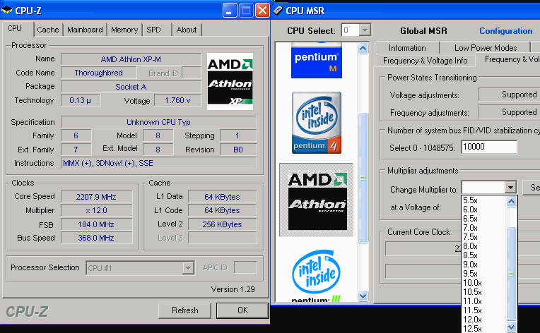 Процессор замобилен. Работает и на 2300Mhz при 1.85v, но греется офигенно. Температура читается по встроенному в проц термодиоду.