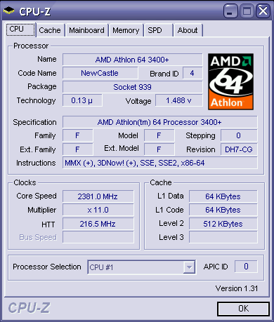 Какая удача, у меня в руках тот самый 3400+ с 2.2Ghz номинальной частотой и c 800Mhz HT. По виду такой же камень, как и другие, только сбоку на крышке прилеплена наклеечка ACER. На номинальных 1.5В камень заработал на частоте в 2381Mhz, при повышении вольтажа до 1.65В - на частоте 2572Mhz. В этом режиме под SnMом он нагревался до 58гр, это с не самым слабым кулером. Ну прямо прескотт какой-то. :)