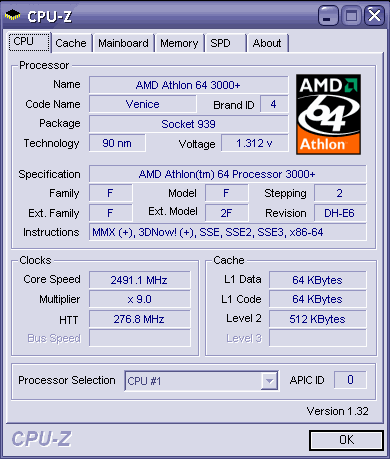 Еще одна трешка 2006 года. 312 - это всего на 3Mhz меньше, чем предыдущий камень этого же года, который меня приятно удивил. Но предыдущий ушел за 2,8Ghz на 1.4V, а этот на 1.55V, греясь при этом ощутимо больше. При напряжении в 1.3V камень стабильно работает на частоте в 2491Mhz, при 1.4V - 2645Mhz, при 1.55V - 2808Mhz. Под SnM FPU TEST температура доходила до 39, 43 и 51 градуса соответственно.