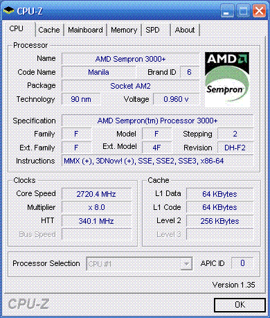 Термодатчик на материнке нагло врет, стабильная работа при 2720Мгц в течении 3 часов под SnM. Кеша 256Кб. Память на 680Мгц пашет при 4-4-4-11 2Т. Напруги везде стандартные.