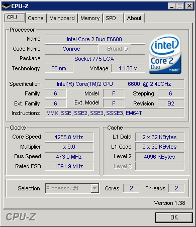 | Разгон, максимально стабильная частота (FSB x Ratio) | 4257 (473 x 9.0) |