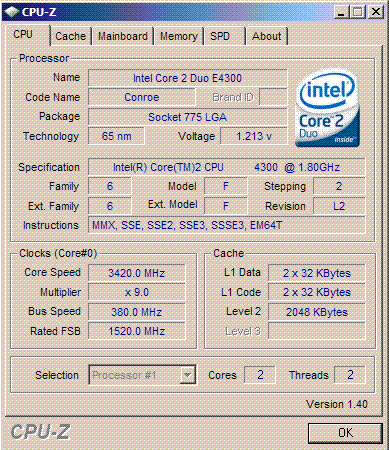 | Разгон, максимально стабильная частота (FSB x Ratio) | 3420 (380 x 9.0) |