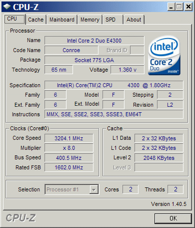 | Разгон, максимально стабильная частота (FSB x Ratio) | 3200 (400 x 8.0) |