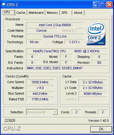 | Разгон, максимально стабильная частота (FSB x Ratio) | 3560 (445 x 8.0) |