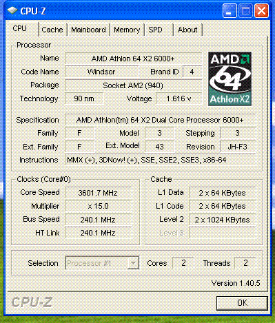 | Процессор (ядро) | AMD Athlon 64 X2 (Windsor) |