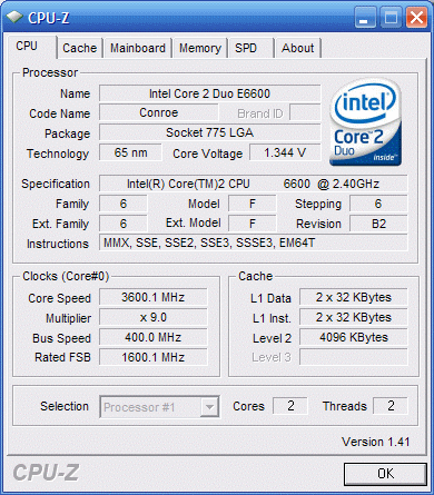 | Разгон, максимально стабильная частота (FSB x Ratio) | 3600 (400 x 9.0) |