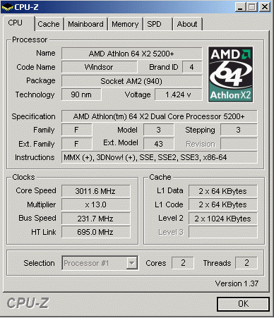 | Процессор (ядро) | AMD Athlon 64 X2 (Windsor) |
