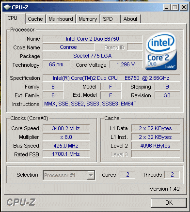 | Разгон, максимально стабильная частота (FSB x Ratio) | 3400 (425 x 8.0) |